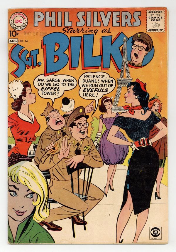 Cover art by Bob Oksner. Be Sure of Your Facts, script by Jack Schiff, art by Win Mortimer; When club funds come up missing, the members of a boy's club are ready to accuse the treasurer of stealing until Buzzy reminds them not to jump to conclusions. Gay Paree!, art by Bob Oksner; Bilko, Doberman and Barbella travel to Paris, France, in order to pick up a dress for Col. Hall's wife so the Halls can go to a Pentagon ball and Bilko can put his latest mercenary scheme into action. Puzzles and games with a military theme by Martin Naydel. Khaki Yaks humor page by Henry Boltinoff. Navy Jibes humor page by Henry Boltinoff. Merry Maneuvers Jibes humor page by Henry Boltinoff. 36 pgs. $0.10. Cover price $0.10.