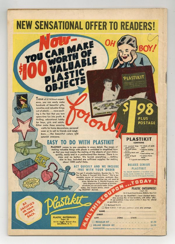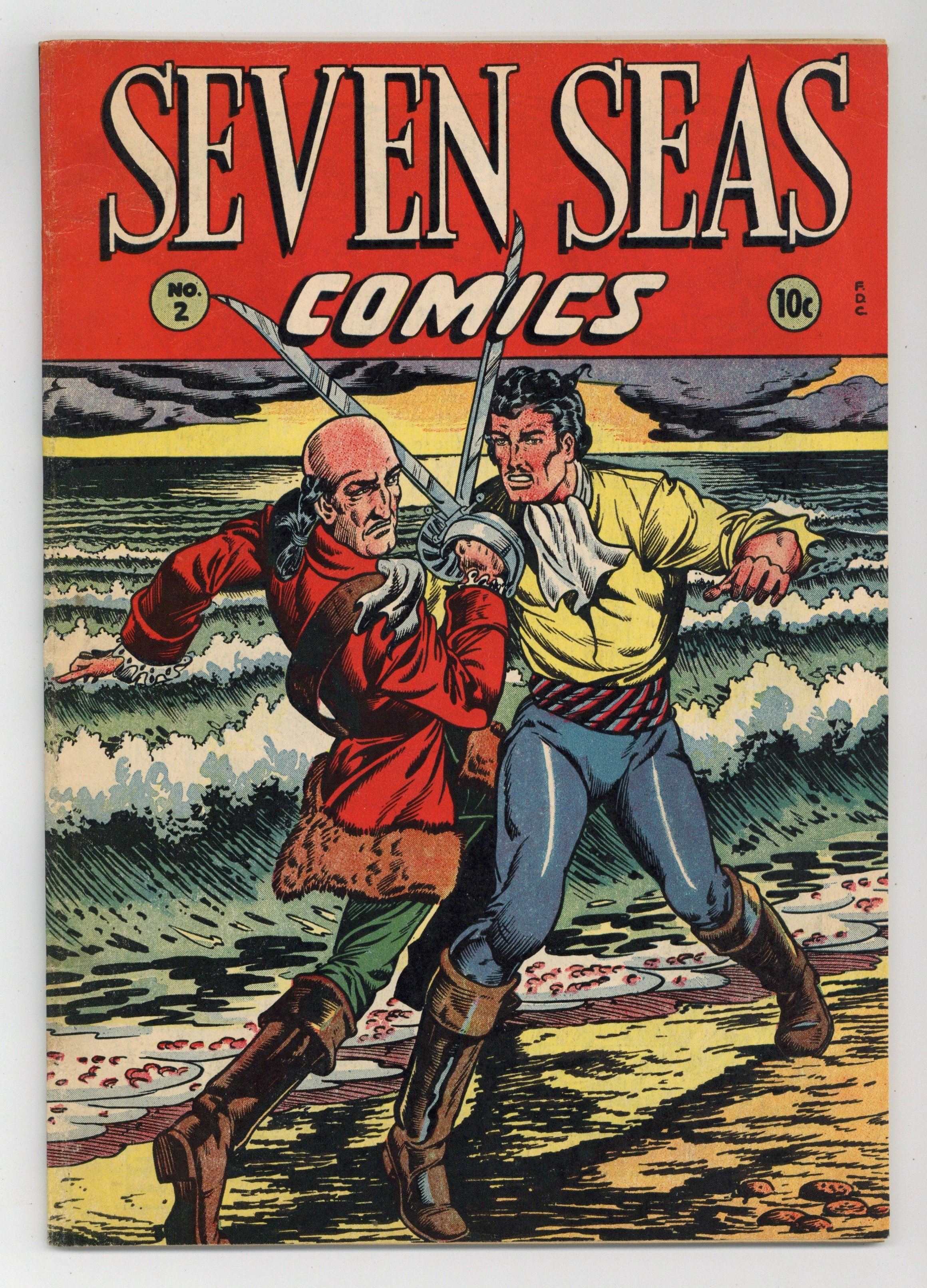 Stories and art by Matt Baker, Ruth Roche, Alex Blum, Frank Little, Manning Lee Stokes, and Bob Hebberd. Tales of adventure on the high seas, produced by comics legend Jerry Iger. A sailor aids Alani when a tribe from the Vanishing Isles attempts to sacrifice women to a beast-man, in a story with art by legendary "good girl" artist Matt Baker. The Ol' Skipper is captured by a tribe that worships cats; luckily, he's a cat person. Captain Cutlass and his men join the fight for an island's water supply. Plus the true story of the Titanic. Terrific swordfight cover may be the work of Robert Webb. Captain Cutlass; Tall Tales; Tugboat Tessie; Harbor Patrol; New Piers for Old; Crossbones Charlie; The Ol' Skipper; Salty Stuff; Sagas of the Sea; South Sea Girl. 48 pages, Full Color. Cover price $0.10.