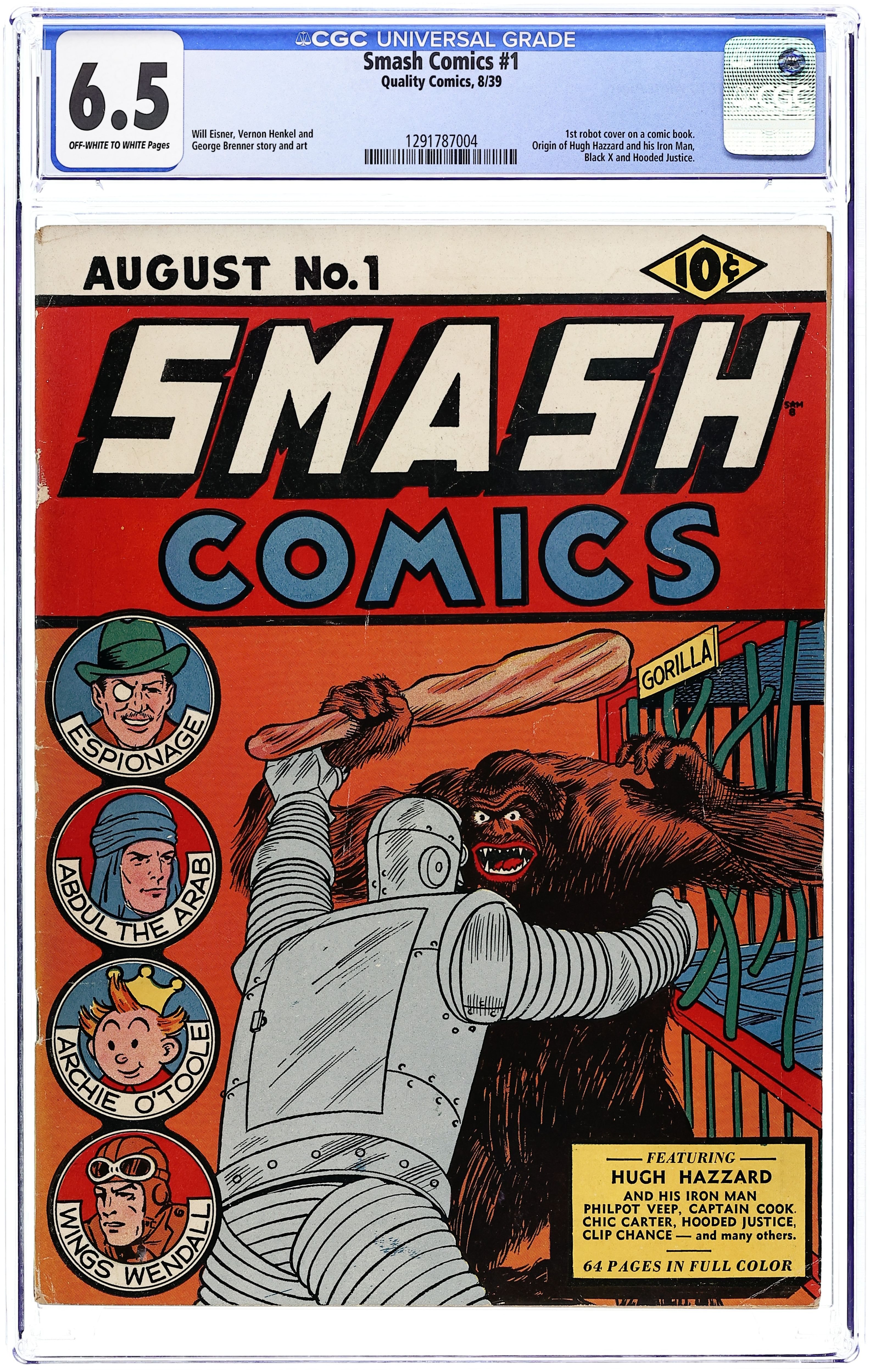 Espionage Starring Black Ace story, script and art by Will Eisner [as Will Erwin]; The Black Spot (a political group) takes over Argentina and conquers most of the rest of South America, before Black Ace intervenes. The Big Radio Hoax starring Philpot Veep, script and art by John Devlin. Chic Carter story, script and art by Vernon Henkel. Simple Simon story, script and art by Ed Conin. Mickey Rooney--Screen Snapshots filler page by Bernard Bail. Wings Wendall story, script and art by Vernon Henkel. Hooded Justice story, script and art by Art Pinajian [as Art Gordon]. Clip Chance at Cliffside story, script and art by George Brenner [as Scott Sheridan]. Captain Cook of Scotland Yard story, script and art by William A. Smith [as Will Arthur]. Abdul the Arab / story, script and art by Vernon Henkel. Iron Monster At Large Again starring Hugh Hazard and His Iron Man, script and art by George Brenner [as Wayne Reid]. 68 pgs. $0.10. Cover price $0.10.