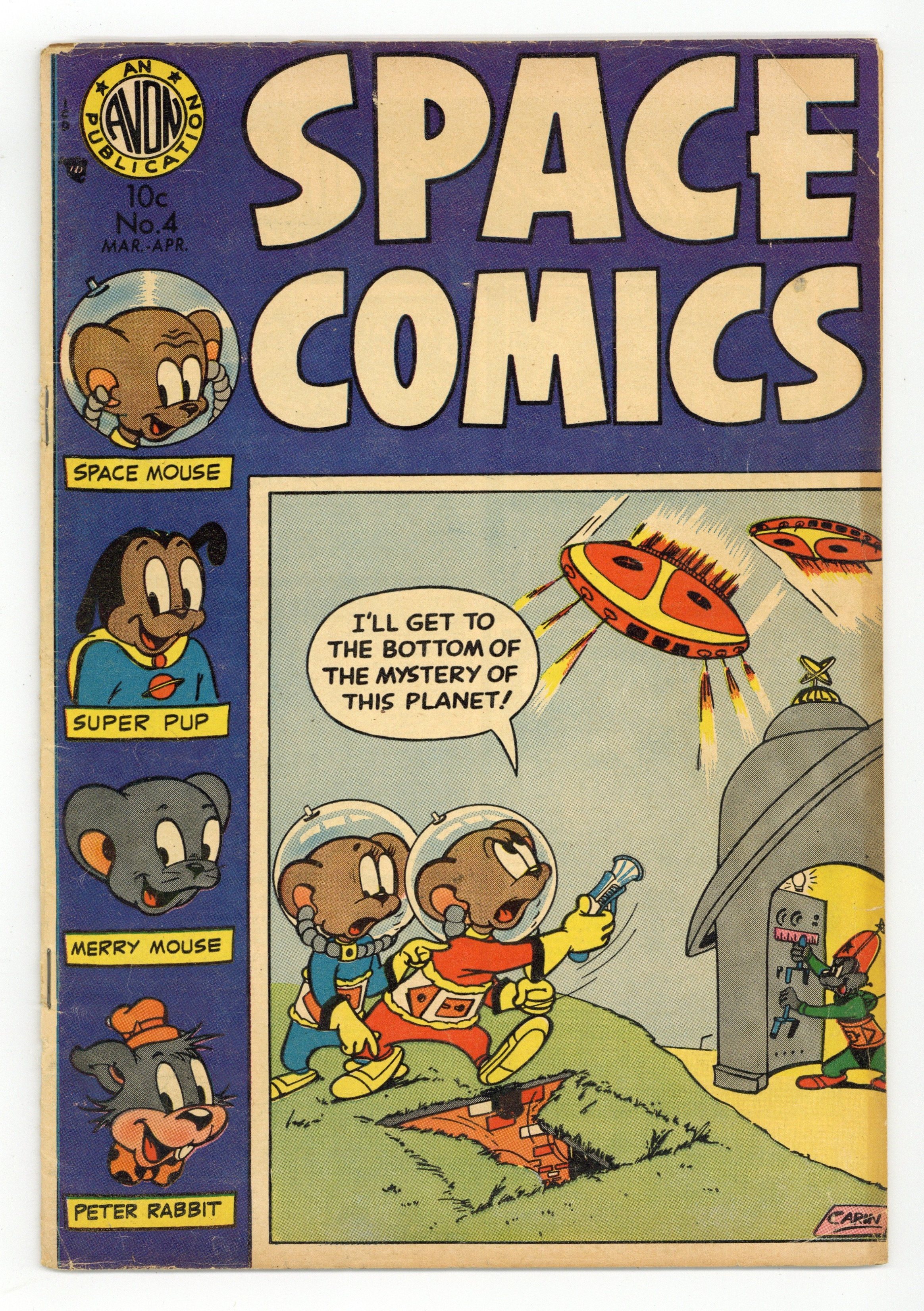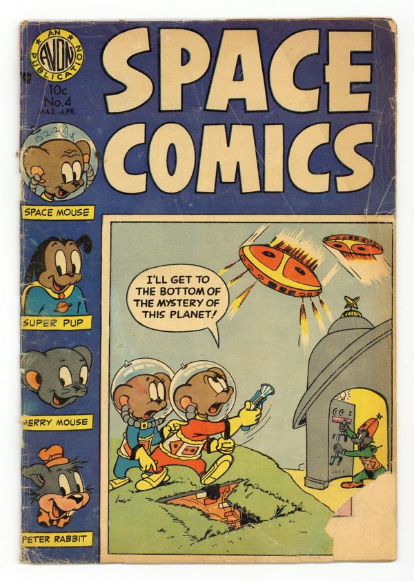 Art by Frank Carin and Bernard Sachs. Cover by Frank Carin. Numbering continues from Funny Tunes (1953 Avon) #3. Funny-animal hijinks featuring Space Mouse, Super Pup, Merry Mouse and Peter Rabbit. Space Mouse investigates a mysterious ship from space; Merry Mouse tracks a strange ape-man in the jungles of Africa; Super Pup is called in when a strange ship docks on Americas space station. Space Mouse: The Hunter!; Super Pup: The Space Platform!; Space Mouse: The Tasty Planet; Peter Rabbit: T.V. or Not T.V.!; Merry Mouse: Jungle Jerk! 32 pages, Full Color. Cover price $0.10.