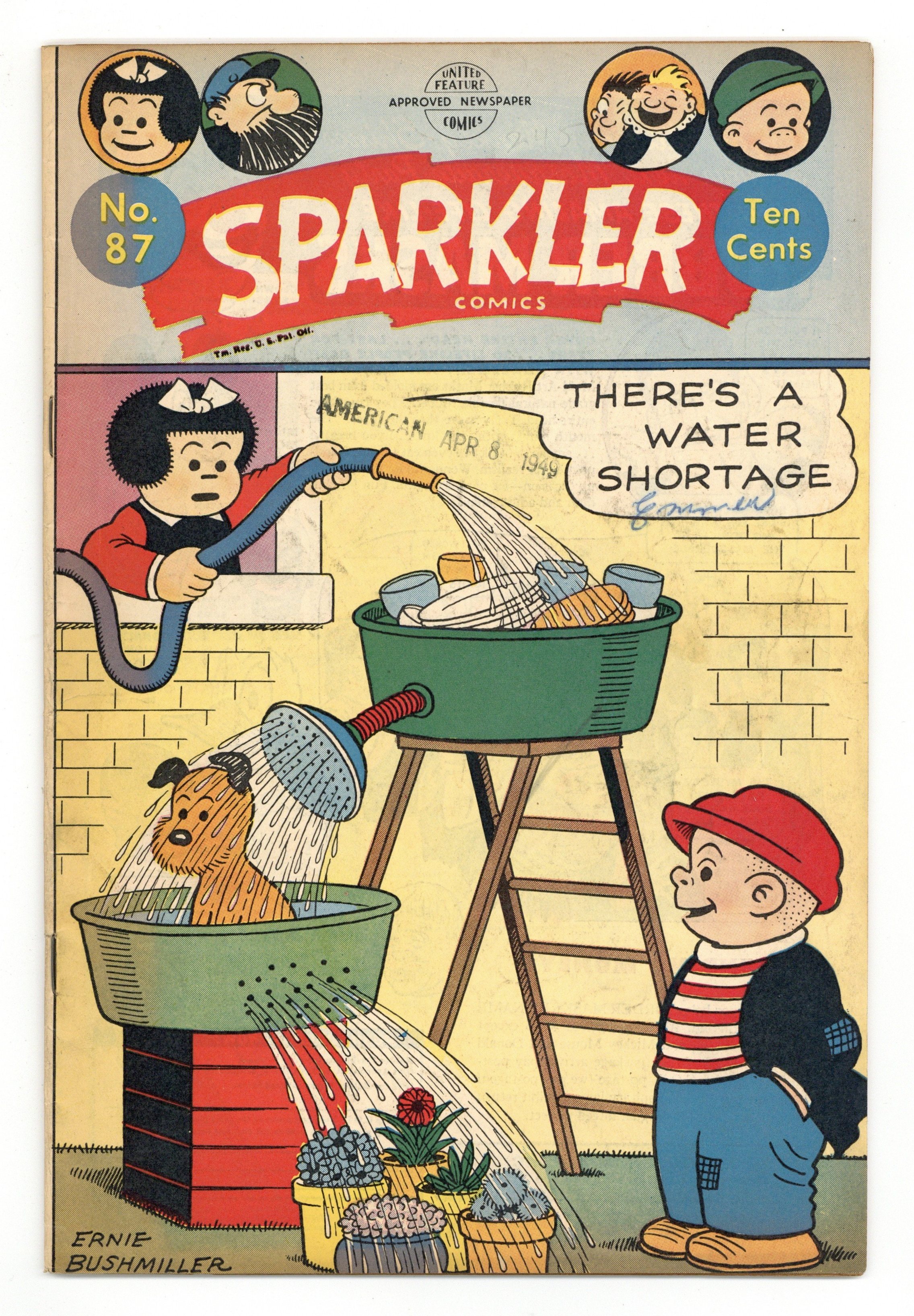 Published Jun 1949 by United Features Syndicate.$24.50Cover by Ernie Bushmiller. Stories and art by Ernie Bushmiller, Rudolph Dirks, Ernest Hix, and Raeburn Van Buren. United's anthology featured reprints of early comic strips, including Abbie an' Slats, Captain and the Kids and Nancy. The new format that started with issue #84 allows for larger reprints of Raeburn van Buren's detailed art on "Abbie an' Slats." Slats' new female boss becomes infatuated with him, and tries to make him jealous. Lost in the jungle, the Captain and the Kids happen upon Professor McDipp and the trained monkeys of his "Jungle School." But when all seems lost, they are saved by the beautiful Princess Tamale and her trained animals. The Family Workshop; Nancy; Strange as It Seems; Captain and the Kids; Abbie an Slats. 32 pages, Full Color. Cover price $0.10.