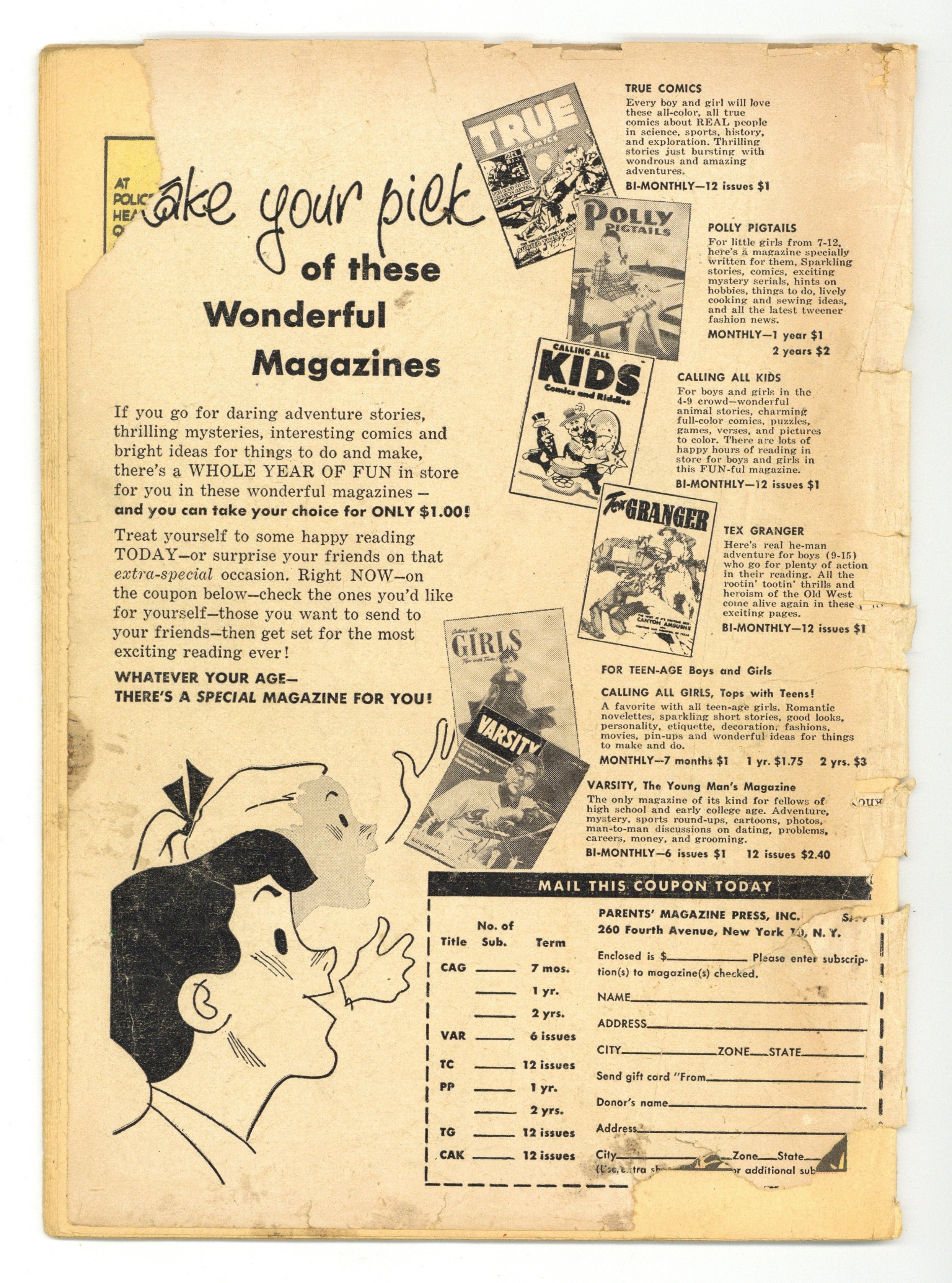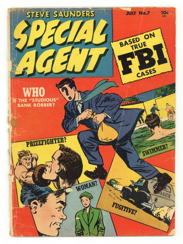 Stories and art by Floyd Torbert and Edd Ashe. Adventures of FBI agent Steve Saunders, originally a backup feature in True Comics (1941). A crook learns as much as he can to improve his capers; Radium thieves accidentally unleash a deadly virus; Michael Trigger tracks an old chum who has turned to crime. Includes a note that the series is "presented with the cooperation of the FBI" and based on authentic cases. Official Story of the FBI; The Case of the Studious Bank Robber; T-Man Michael Trigger; Sports Champs: Robert Grant; The Boys' Club of America Prepares for the Camping Season; Chip Downs' Crime Lab; Ellsworth Vines. 32 pages, Full Color. Cover price $0.10.