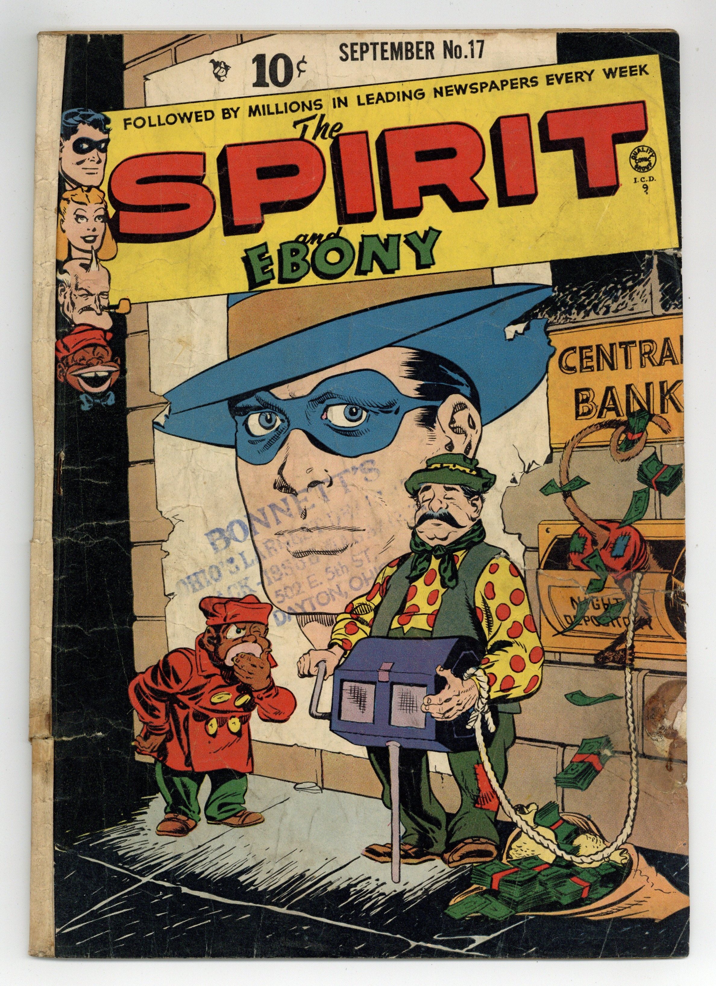 Cover art by Will Eisner. Untitled Spirit story featuring The Organ Grinder, script by Bill Woolfolk, pencils by Lou Fine, inks by Lou Fine and the Quality shop. Untitled Spirit story featuring Big Jake Gooley, script by Manly Wade Wellman, pencils by Lou Fine, inks by Lou Fine and the Quality shop. Two Flatfoot Burns stories, scripts and art by Al Stahl. Untitled Spirit story featuring The Metal Monsters, script by Bill Woolfolk, pencils by Lou Fine, inks by Lou Fine and the Quality shop. Jonesy humor page by Bernard Dibble. 36 pgs. $0.10. Cover price $0.10.
