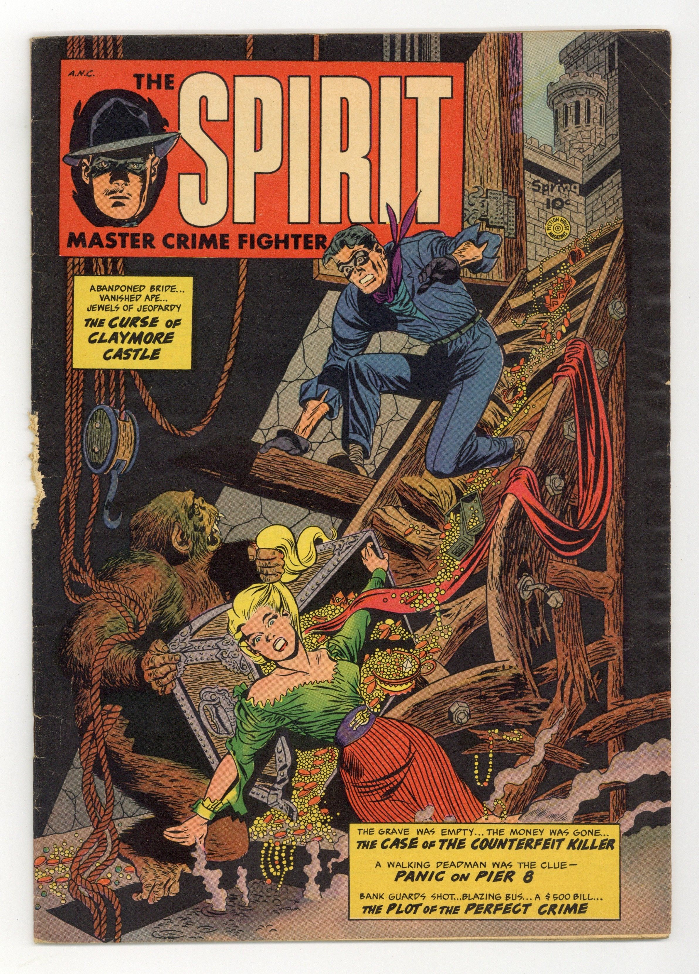 Stories by Jules Feiffer. Reprints of the later years of the Spirit strip, when Will Eisner's crimefighter was being run by other cartoonists in his studio. This issue includes Spirit strips #586, 590, 596, and 597. A man claiming to be Denny Colt suddenly shows up in Central City demanding his inheritance - but Denny Colt is The Spirit; A strange tale involving an abandoned bride, a missing treasure, a mysterious ape, and several murders; Young Marvin resolves to plot the perfect murder and get away with it. The Case of the Counterfeit Killer; The Curse of Claymore Castle; The Plot of the Perfect Crime; Panic on Pier 8. 32 pages, Full Color. Cover price $0.10.