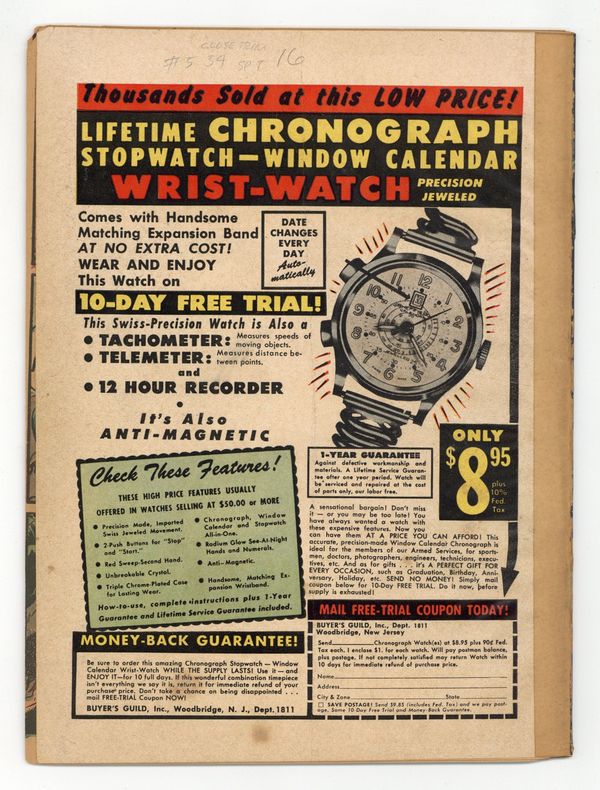 Published 1954 by Fiction House.$40.00- Interior is complete. Full length spine split through cover and most wraps. RESTORATION. Color touch, TRIMMED. Tape on interior cover and pages. Brittle.