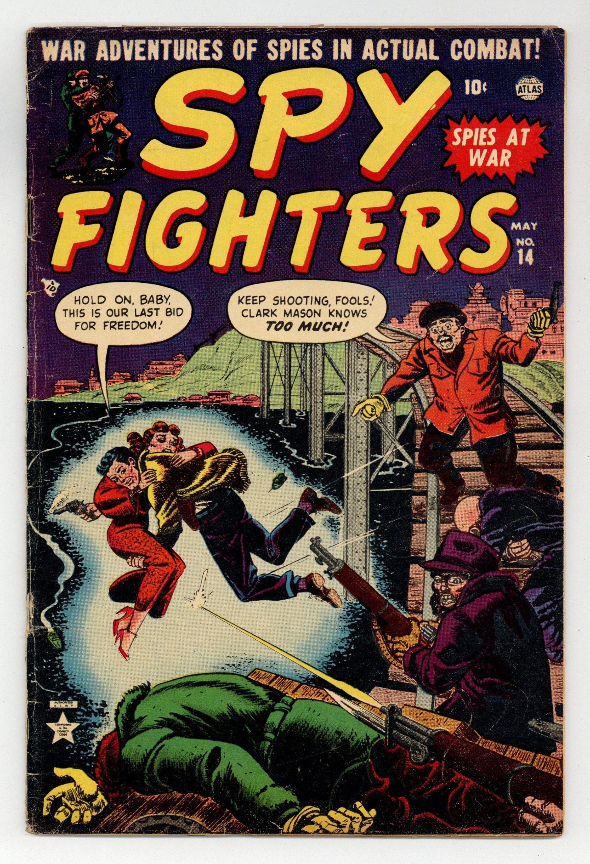 Cover inks by Sol Brodsky. Passage To Hong Kong starring Clark Mason Spy Fighter, art by Mac Pakula. Privates Mike and Ike text story. The Big Surrender starring Clark Mason Spy Fighter, art by Mac Pakula. Passport to Death, art by Ed Winiarski. Death Mission starring Clark Mason Spy Fighter, art by Mac Pakula. 36 pgs. $0.10. Cover price $0.10.