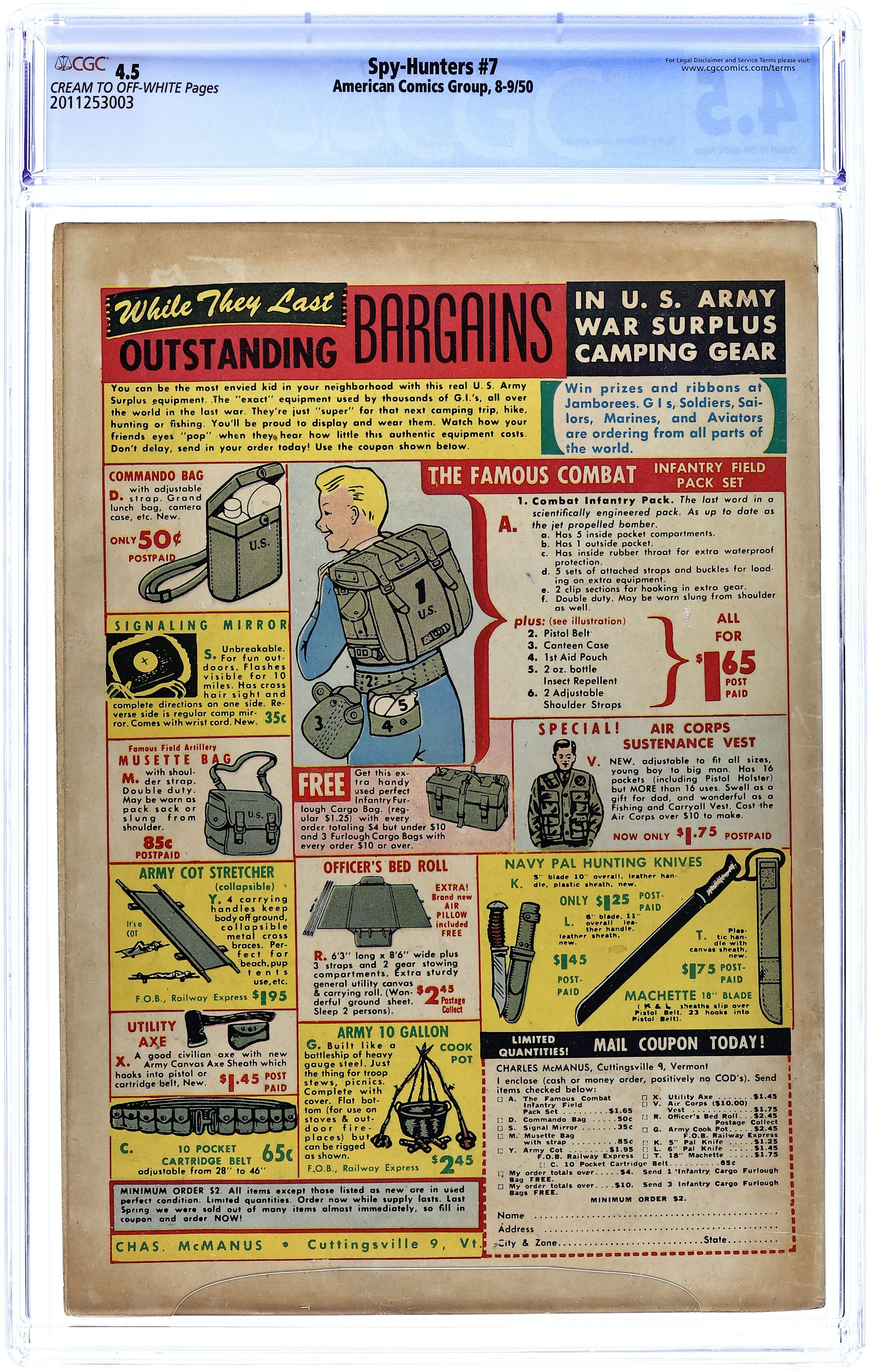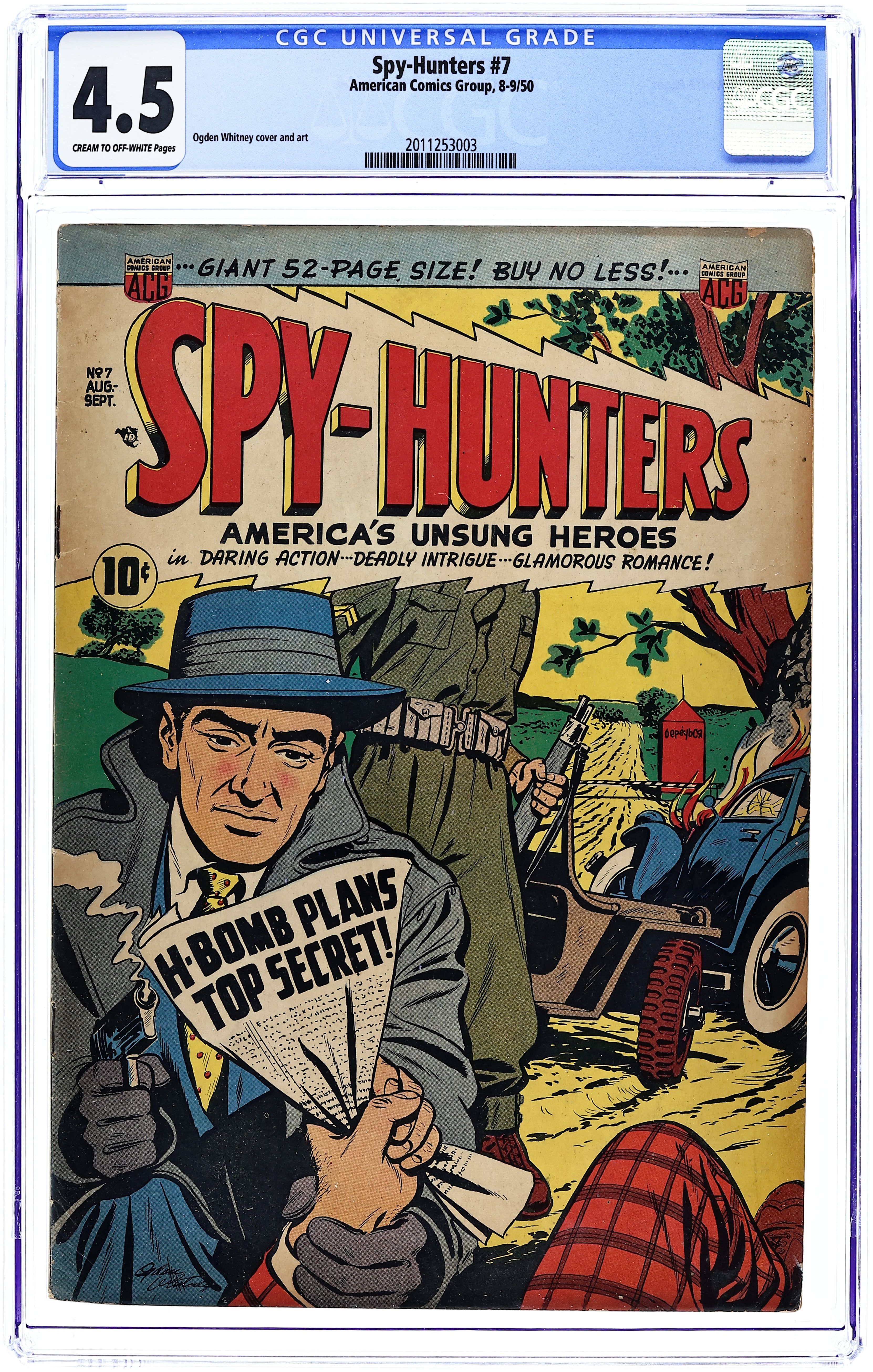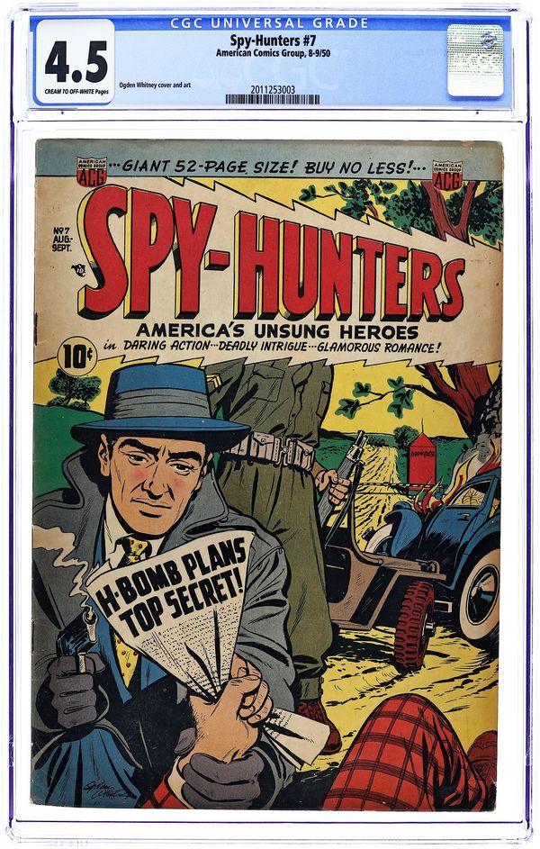 Cover by Ogden Whitney. Edited by Richard E. Hughes. Stories by Richard Hughes. Art by Ogden Whitney, Charles Sultan, Howard Larsen, Lin Streeter, and Bob Jenney. Tales of espionage from legendary early independent comics publisher ACG, published as the Cold War was just heating up. A reporter discovers communist agents in newly liberated Indonesia; Scientist Rick learns that communists are testing atomic weapons in Antarctica; The true-life tale of the treasonous air-raid warden. Jonathan Kent, Espionage Ace; Blowup in Batavia; A Match for Spies; Storm Over the South Pole; Trapped by Ivy; King of Spies; Smuggler's Stunt; True Espionage Cases: The Case of the Traitorous Air-Raid Warden; South American Smashup. 48 pages, Full Color. Cover price $0.10.