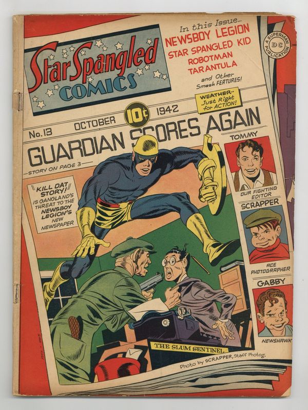 Cover pencils by Jack Kirby, inks by Joe Simon. The Scoop of Suicide Slums! starring The Newsboy Legion, script by Joe Simon and Jack Kirby, pencils by Kirby, inks by Simon; The boys get a loan from Officer Harper to start publishing their own local newspaper. The Man Who Could Make Dreams Come True starring The Star Spangled Kid, art by Hal Sherman. The Skirmish of the Spider and the Fly starring Tarantula and Solomon Grundy, art by Harold Sharp. Case of the Smiling Statue starring Penniless Palmer, art by R. L. Ross. The Perilous Passage starring TNT and Dan the Dyna-Mite, art by Louis Cazeneuve. Robotman story, script by Jerry Siegel, art by Sam Citron. 68 pgs. $0.10. Cover price $0.10.