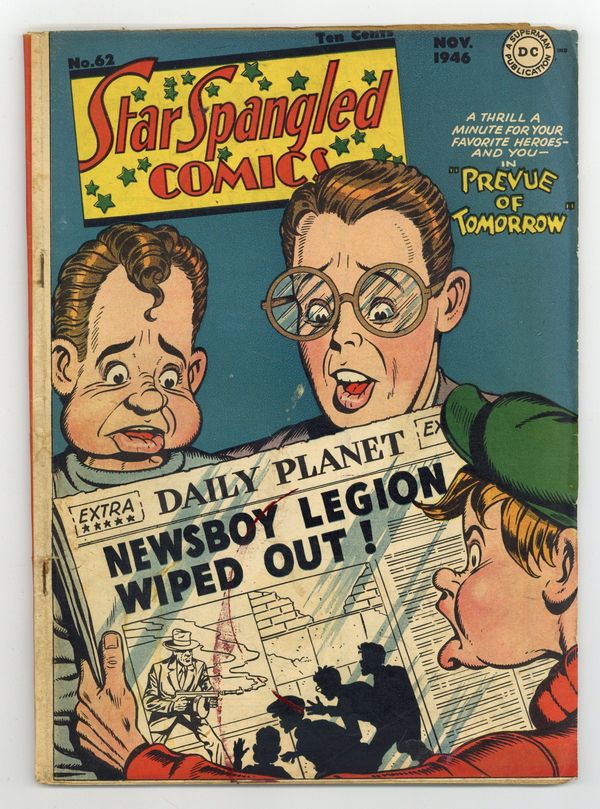 Cover pencils by Curt Swan, inks by Stan Kaye. Prevue of Tommorrow starring the Newsboy Legion. False Arrest starring Penniless Palmer, art by Thurston Harper. The Magnet Mob starring Robotman, art by Jimmy Thompson. The Crime Carmen starring Star Spangled Kid, art by Jon Small. The Phantom Swordsman starring Liberty Belle, script by Don Cameron, art by Chuck Winter. 52 pgs. $0.10. Cover price $0.10.