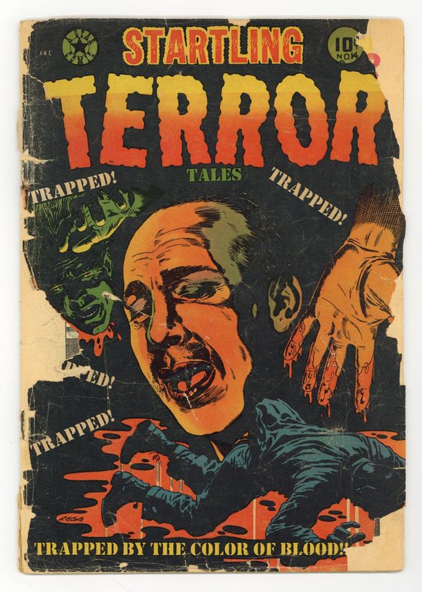 Cover by L. B. Cole. Stories and art by Jay Disbrow and others. Pre-Code horror and crime comics from L. B. Cole's Star Publications. Prohibition-era Chicago hoods think they're being arrested, but the cops turn out to be the architects of the Saint Valentine's Day Massacre. Teen hood Jack Hammer graduates to truck hijacking, but a scheme for revenge proves his undoing. Trapped by the Color of Blood; The Man Died; The Shocking Massacre; The Bloody Era...!; The "Lone Wolf" of Fear. Final issue of the series; followed by Startling Terror Tales (1953-54 2nd Series) #4. 36 pages, Full Color. Cover price $0.10.