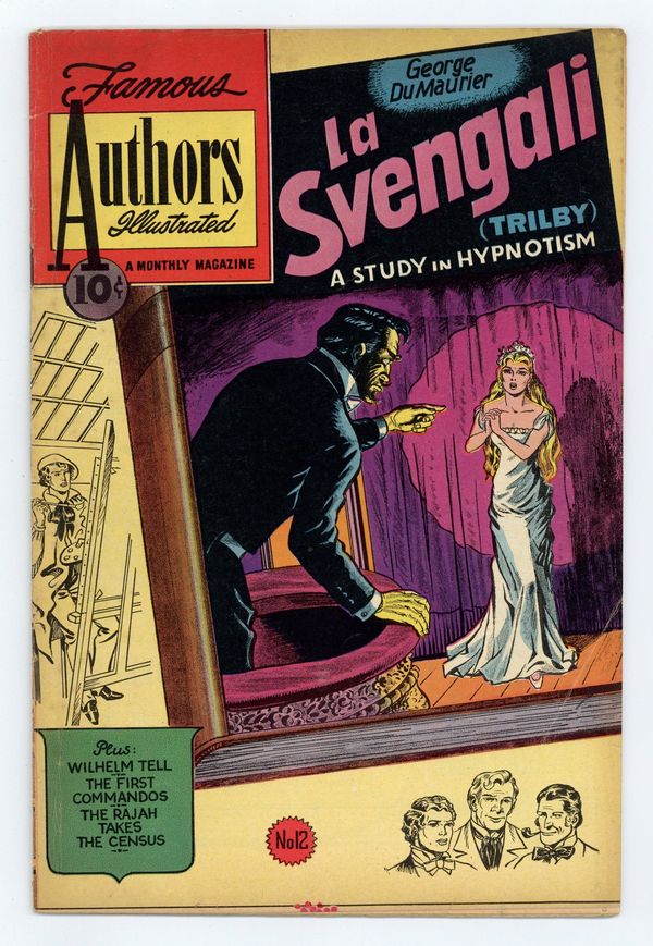 "La Svengali" (The Story of Trilby), script by George du Maurier (original author), art by Gustav Schrotter; The story of Trilby OFerrall, an artists model in Paris, who falls under the spell of the compelling Svengali, a musician who trains her voice through hypnosis and turns her into a singing star; The pair travels throughout Europe on successful concert tours, Trilby as La Svengali, the famous singer, and Svengali as the accompanying orchestra conductor. "The First Commandos, or The Flowers of Begtash" historical article. "Wilhelm Tell" one-page historical story. "How the Rajah Took the Census" text story. La Svengali illustration on the back cover. 36 pgs., full color. Cover price $0.10.