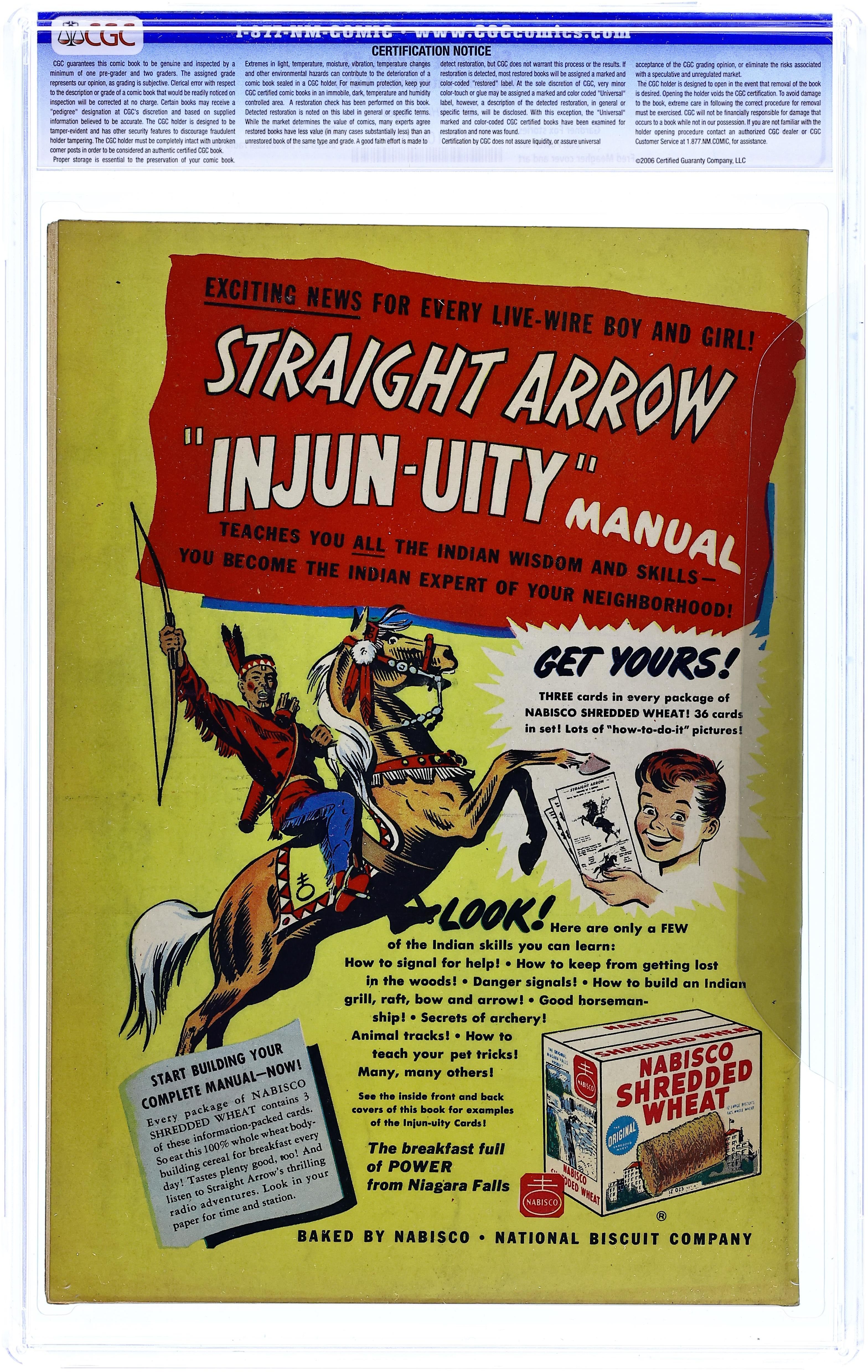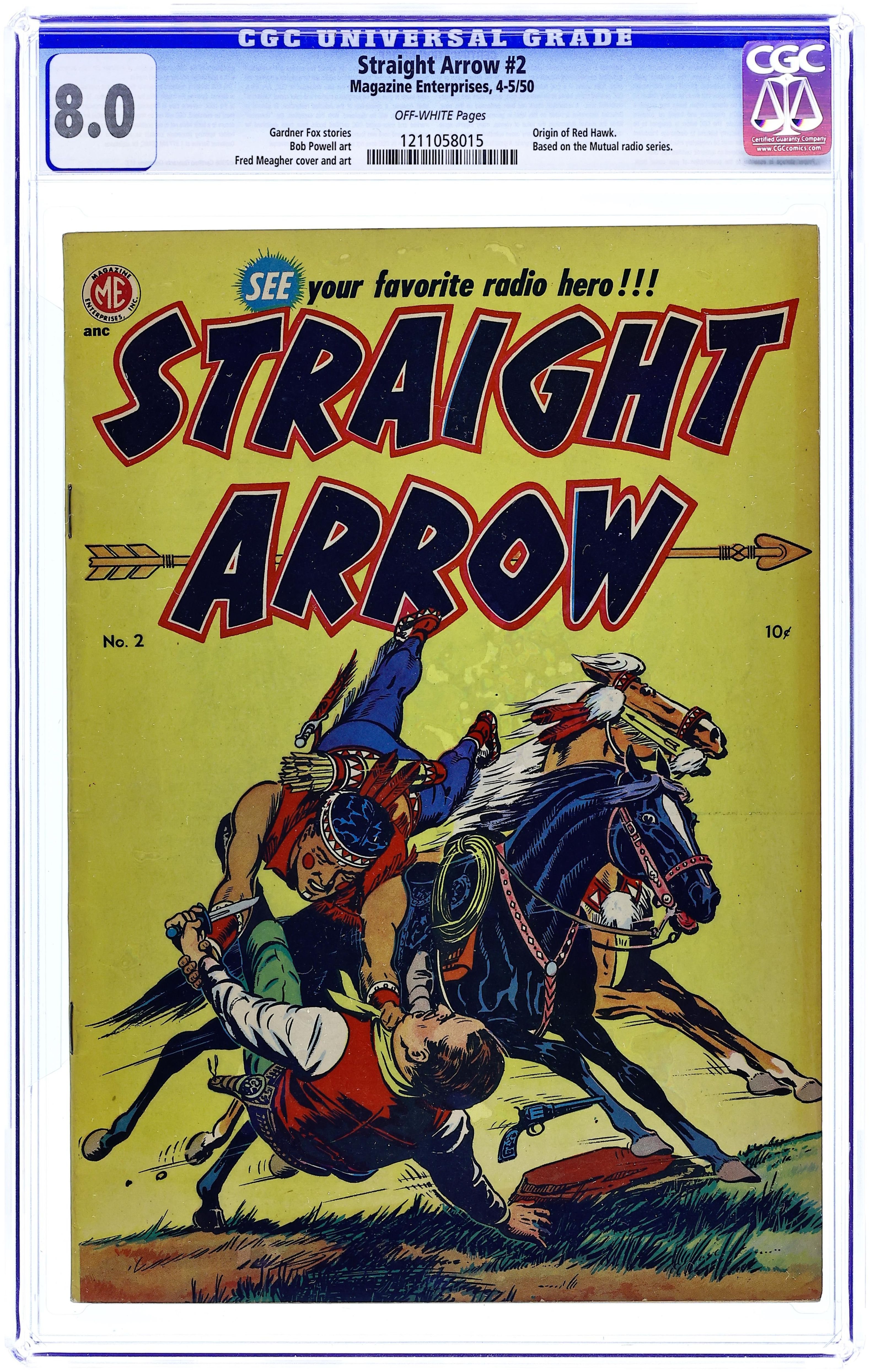 Stories by Gardner Fox and others. Art by Bob Powell and Fred Meagher. Cover by Fred Meagher. Rancher Steve Adams, a Comanche raised by white settlers, has a secret identity as the warrior Straight Arrow, a hero who first appeared on a popular radio show. Steve tries to track down the outlaws who robbed a wagon train, but he has more luck as Straight Arrow. Red Hawk seeks his father's killers, strange men in fearsome green bird masks. An escaped killer masquerading as a Comanche encounters Straight Arrow, who is the real thing. Plus non-fiction features on tepees and other Western camps. Tepee; The Peril of the Pioneers!; Land of Our Fathers; Fangs of the Wild; Red Hawk: The Men of the Green Feather!; The Death Moccasin!; Proper Camp. 32 pages, Full Color. Cover price $0.10.