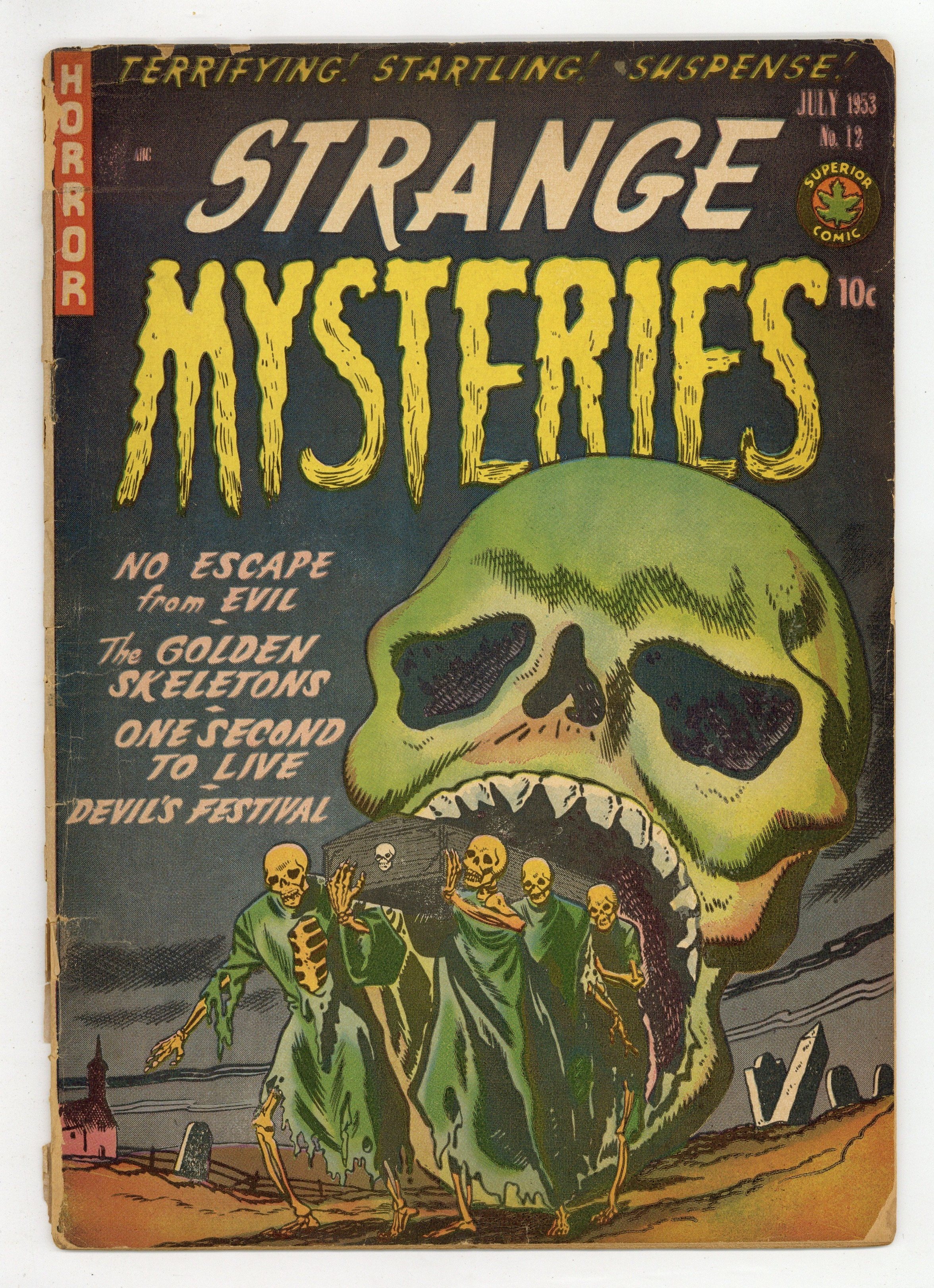 Jack Kamen-ish art and stories. "The Golden Skeletons"; A cemetery caretaker and his wife discover that the cemetery's skeletons have turned to gold; They take them to their house and grind them into gold dust. "One Second to Live"; A convicted murderer relives his life in the second of his hanging; He sees his mother murdered and his discovery that his father was the murderer. "Fatal Proof" text story by John Martin. "No Escape from Evil"; A woman marries an old man for his money; She pushes him off a cliff. The old man although dead returns to kill the widow's new boyfriend. "Devil's Festival"; The village of Walpurgen in Austria, destroyed by Turks, reappears every 100 years; An American couple chances upon it, sees hangings, torture and stonings, and is almost burned at the stake. 36 pgs., full color. $0.10. Cover price $0.10.