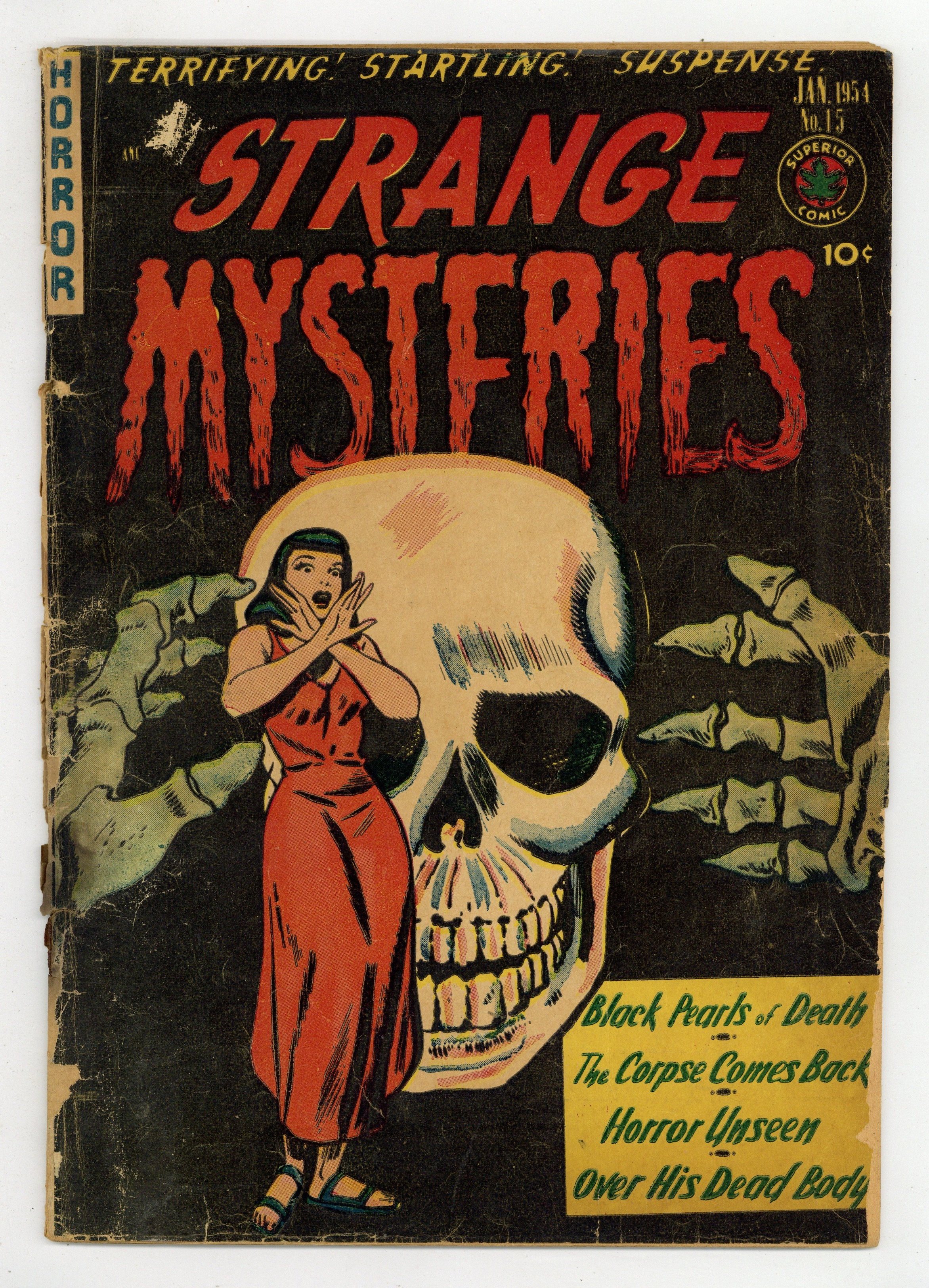 Jack Kamen-ish art and stories. "The Corpse Comes Back"; A lawyer murders his partner and buries the body in 5 states; The dead man is stitched together and sent back to get revenge; His body falls apart and the lawyer tries to destroy him with acid and bury him in a trunk. "Black Pearls of Death"; Two men force islanders to dive for them to steal black pearls from a sunken idol; Once they get the pearls, they kill the islanders. "Horror's House" text story by John Martin. "Over His Dead Body"; A woman suspects that her husband returning from a business trip is abnormal; His skin is cold and he never sleeps; He refuses medical exams; She cheats on him. "Horror Unseen"; A scientist accidentally turns into a glass man; He steals money and wears makeup to fool his new bride; She is suspicious, discovers that he is glass, and is killed by him. 36 pgs., full color. $0.10. Cover price $0.10.