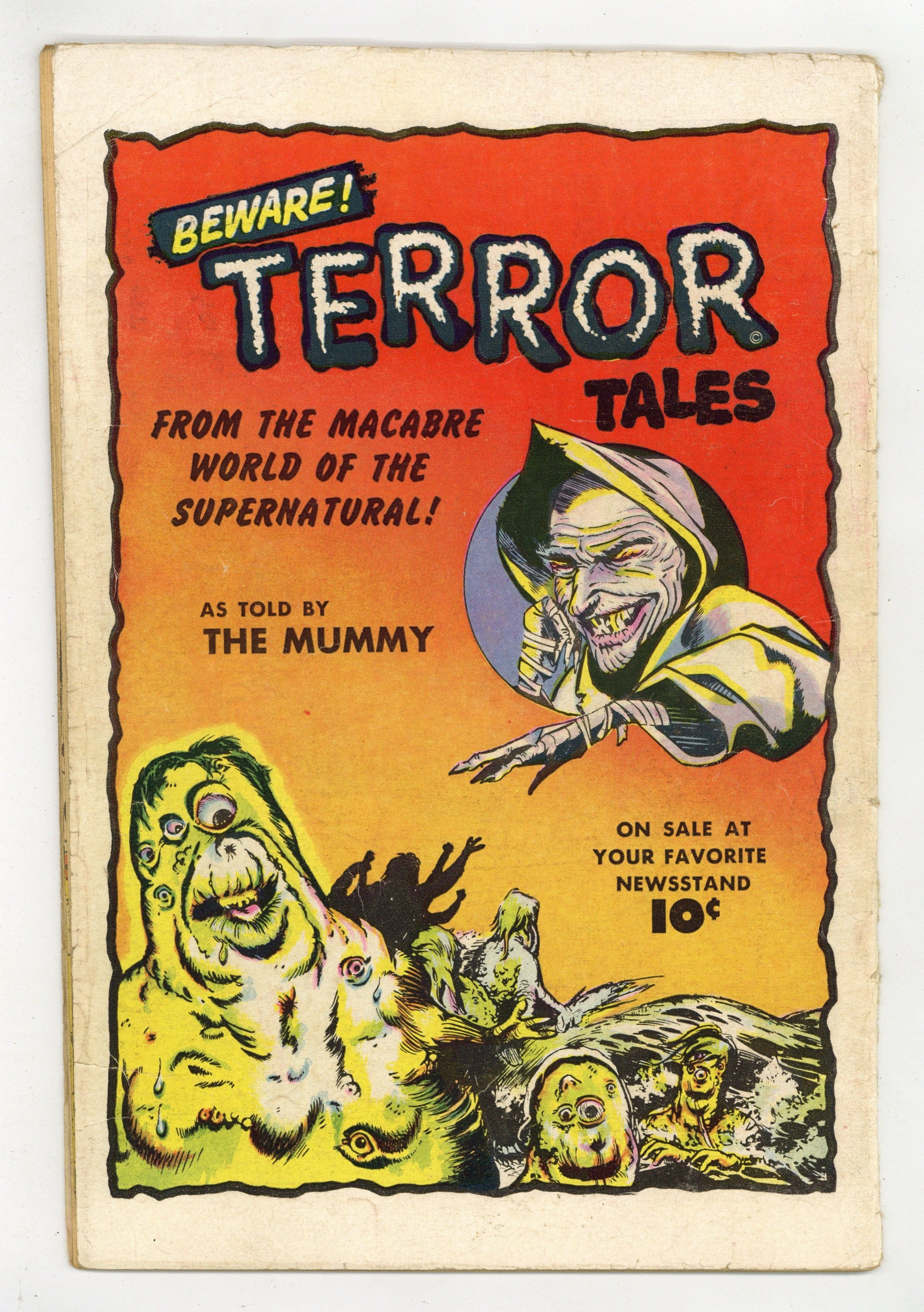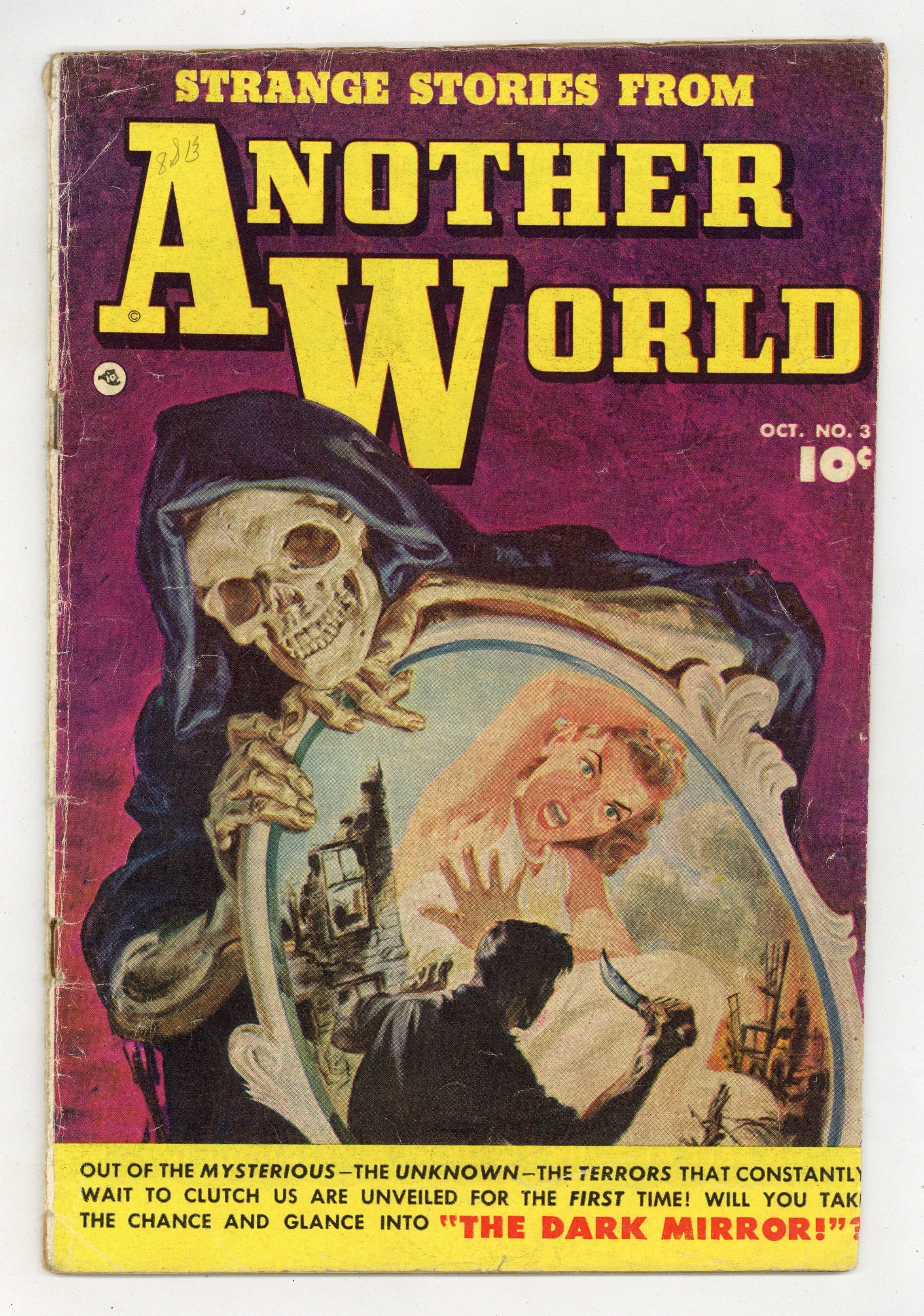 Painted cover by Norman Saunders. Stories and art by John Martin and Bob McCarthy. Classic pre-Code horror from Fawcett. Criminals Louie and Gabe are warned by the living embodiment of Fate herself, and still aren't moved to change their ways. George murders his business partner to get his ornate seaside mansion, but the drowned corpse returns as the angry undead. Barry's magical glasses allow him to see the spirits of the dead. Classic, pulpy painted cover by Norman Saunders. The Dark Mirror; Death To The Dreamers; The Thing From The Lake; The Unseen. 32 pages, Full Color. Cover price $0.10.