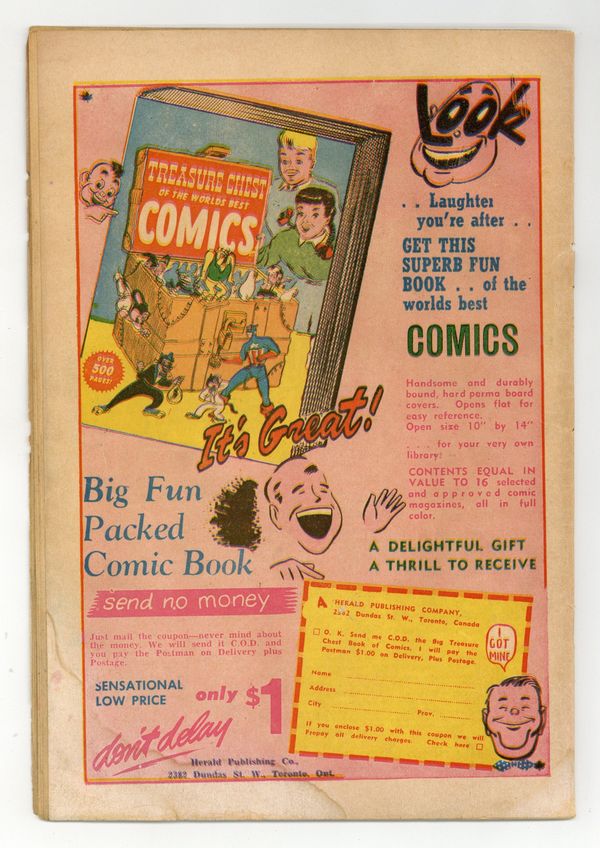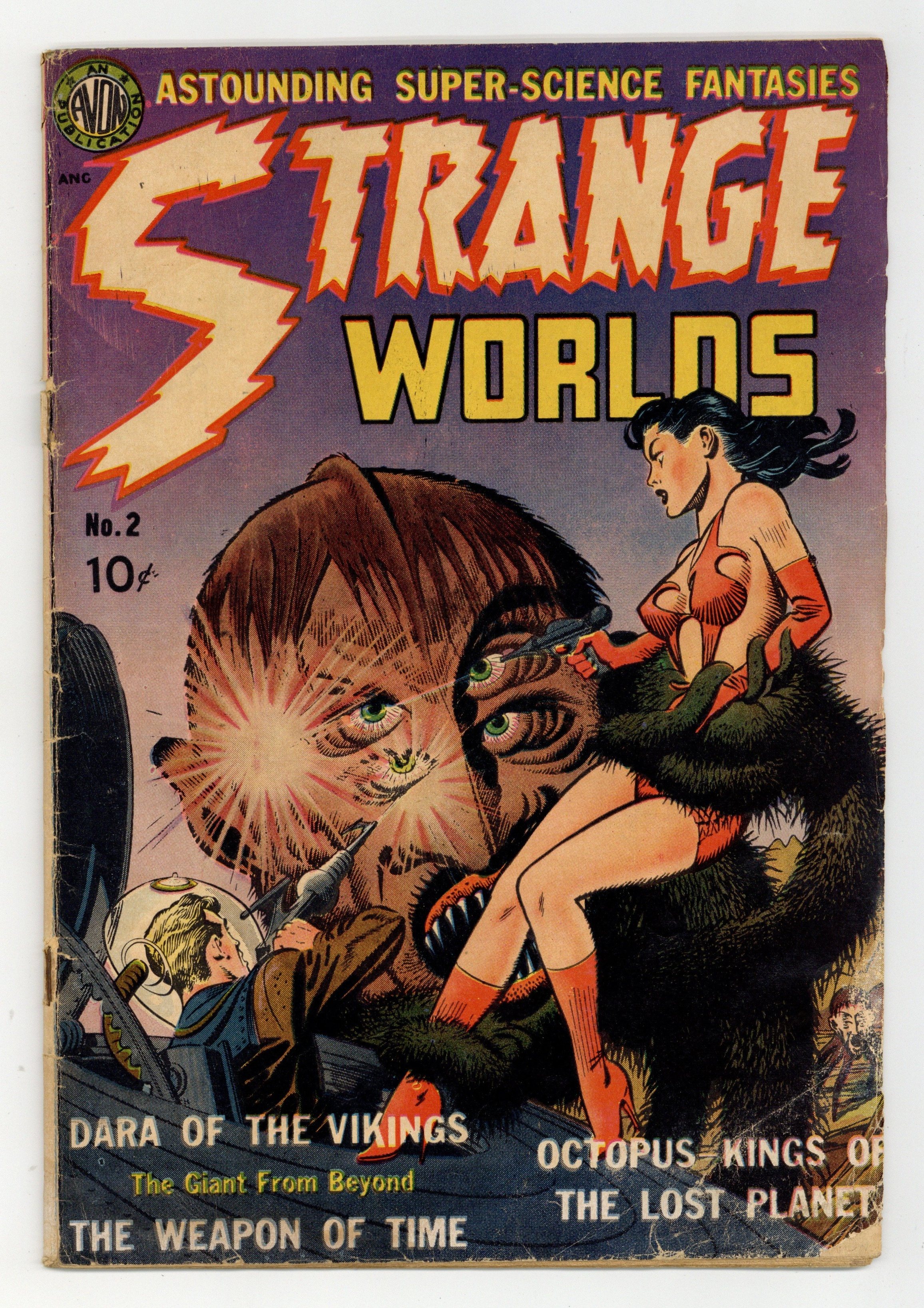 Stories by Donald A Wolheim (credited as W. Malcolm White), and Gardner Fox. Art by Wally Wood, Joe Orlando, Walter Palais, Richard Case, Manny Stallman and John Giunta. Cover by Gene Fawcette. Science fiction adventure from Avon, featuring stories and art from legends in the comics and sci-fi fields. The strange tale of the leopard cult of Africa; Modern-day explorers discover a lost world of Vikings, including the beautiful Dara and the evil Cyngar; Crom the Barbarian battles a giant named Balthar to save Ophir's caravans. This issue was mentioned in Werthams Seduction of the Innocent as an example of the "injury-to-the-eye motif," probably for a scene in "The Giant from Beyond." The Leopard Men; Dara of the Vikings; Crom the Barbarian: The Giant from Beyond; The Weapon Out of Time; Octopus-Kings of the Lost Planet! 36 pages, Full Color. Cover price $0.10.