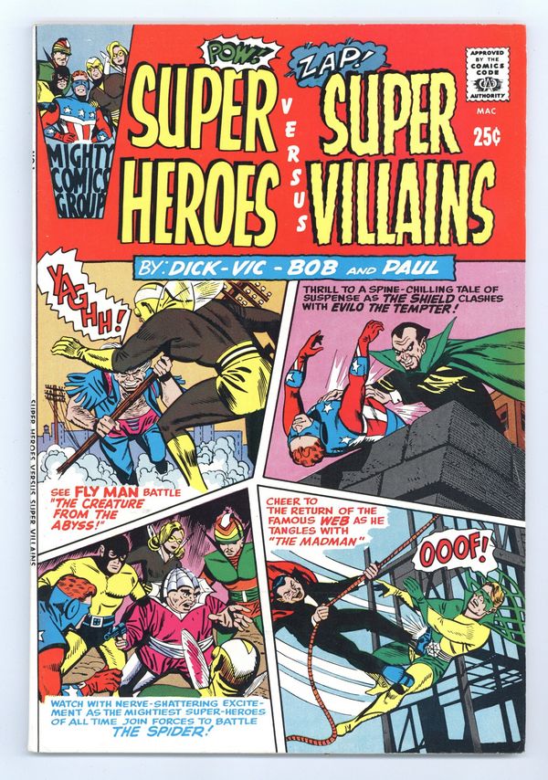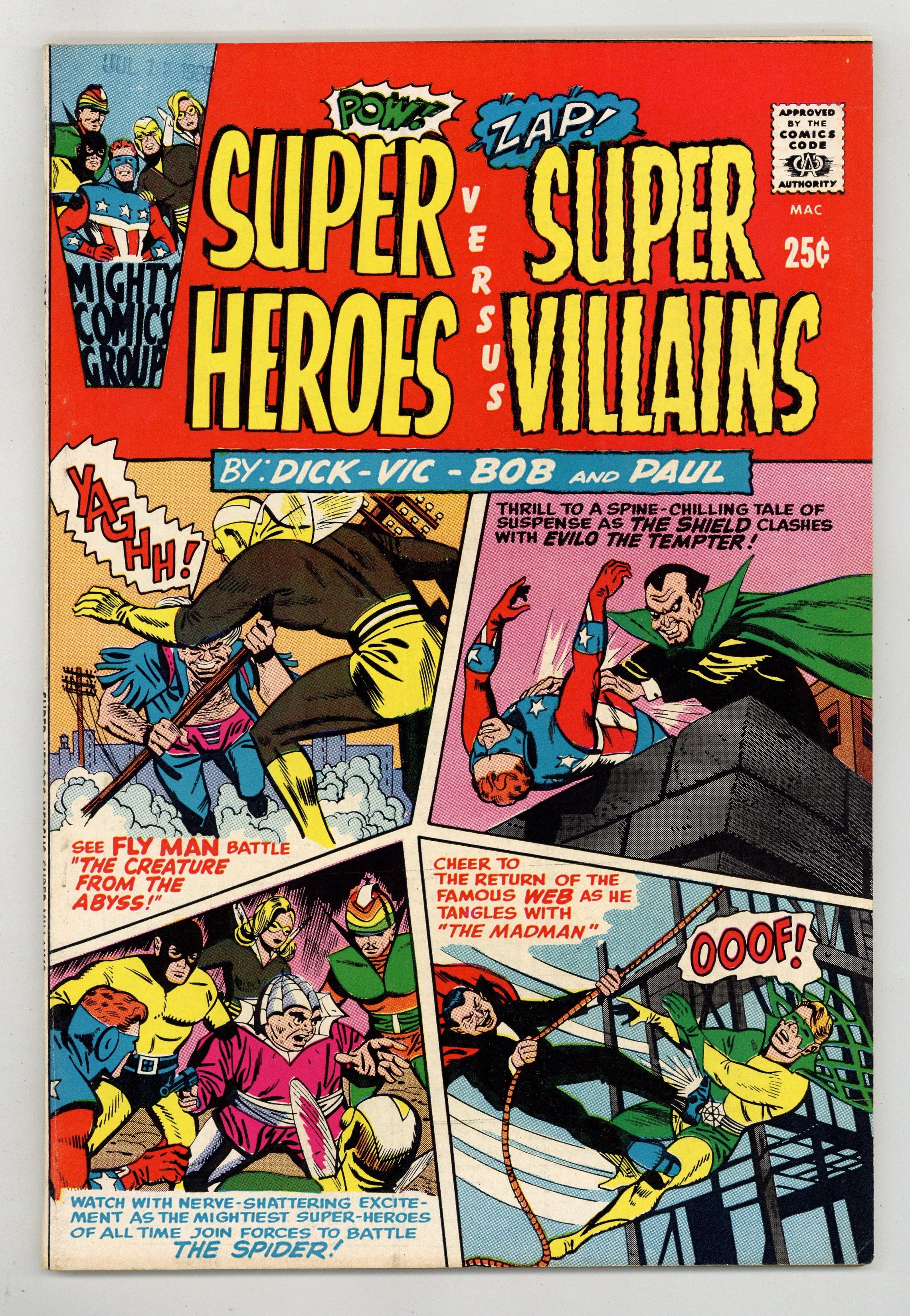Tags: Hero/Villain TeamsPublished Jul 1966 by Archie Publications.$27.50Cover by Paul Reinman. "The Creature from the Abyss," script by Jerry Siegel, pencils by Paul Reinman, inks by Frank Giacoia; The Terrible Titan ascends from Subterrania and plans on conquering the surface world using radiation poisoning; Only Fly-Man and the Black Hood can hope to stop him. Cheerios ad with Rocky and Bullwinkle. "Evilo The Tempter," script by Jerry Siegel, pencils by Mike Sekowsky, inks by Paul Reinman; As the Shield thwarts a robbery at a museum, the robbers accidentally wake up a mummified evil sorcerer named Evilo the Tempter. 36 pgs., full color. Cover price $0.25.