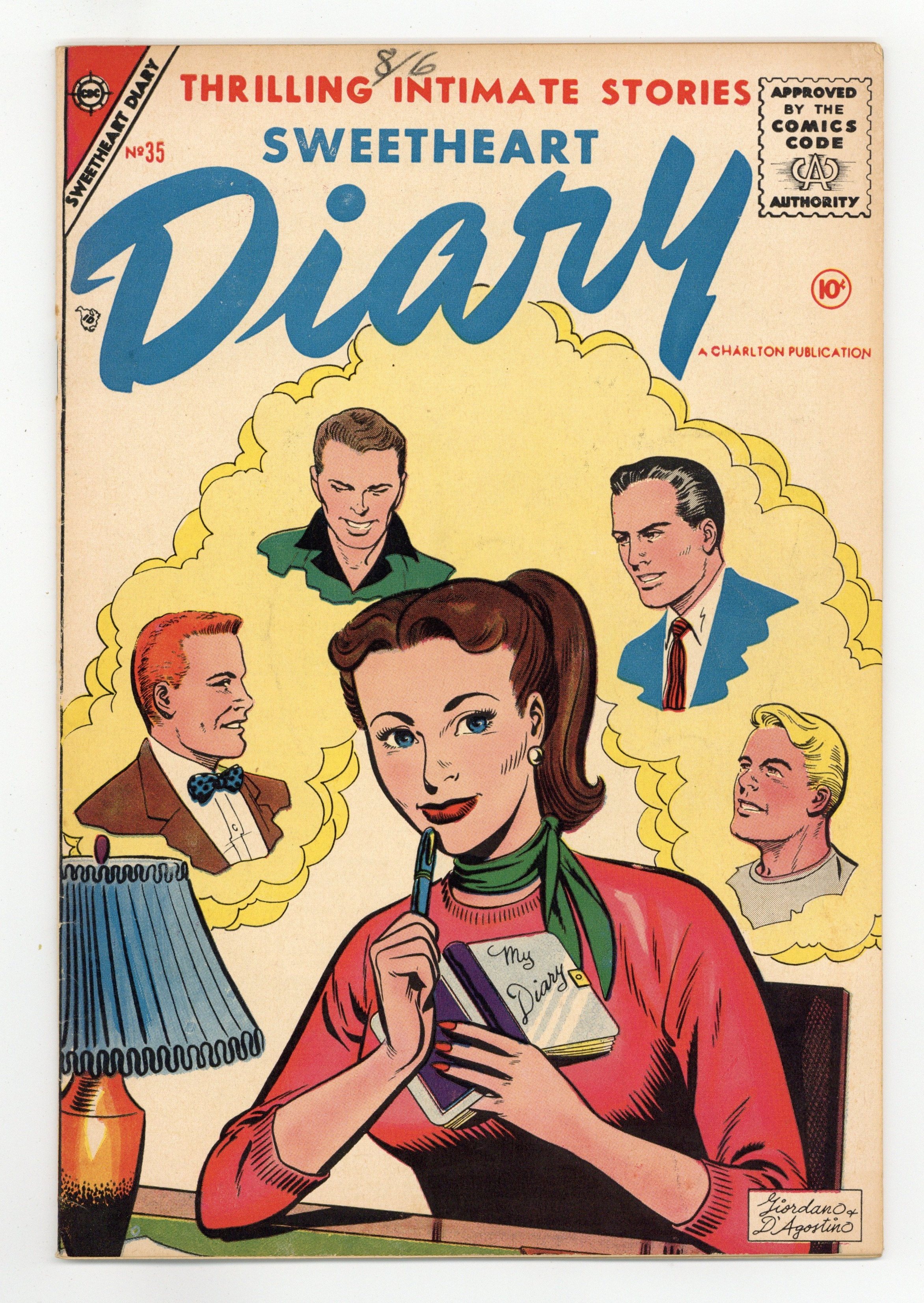 Cover by Dick Giordano and Jon D'Agostino. Stories and art by Charles Nicholas and Vince Alascia. Diary-centric stories of romance and heartbreak from Charlton. After her father's death, Sue wants a man with a safe occupation, so it's too bad she falls for Bill, the high-rise window washer for her office building. Joyce gets bored with George, until she realizes that Myra wants him back, and then she gets possessive. Fashion designer Velma leaves her job and her boyfriend Steve to work as an apprentice to designer Ray, but that's not as good a deal as it sounds. The Safer Love; Depression; They Belong to Me; Green Love; Everything Is Wrong; My Guilty Heart; Customs of Courtship. 32 pages, Full Color. Cover price $0.10.