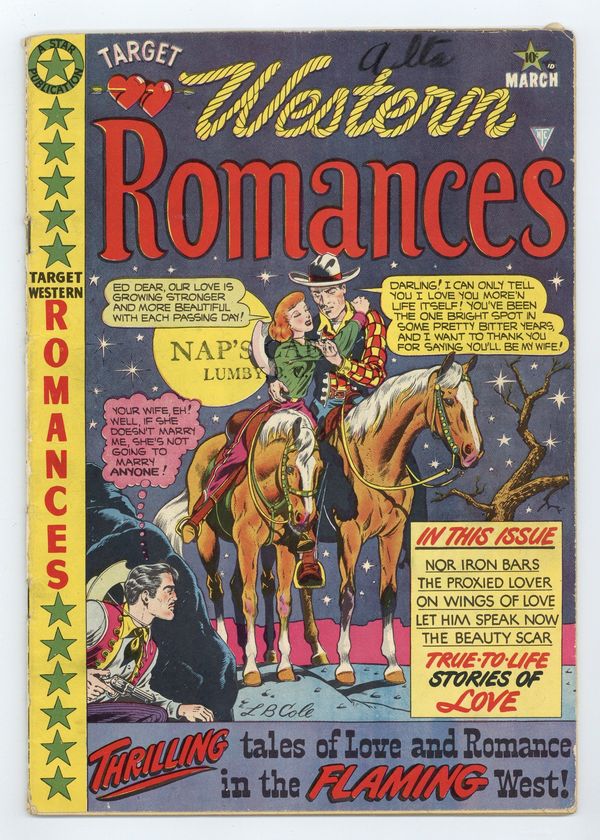 Cover by L. B. Cole. Stories and art by N. Nodel, Milt Hammer, George Peltz and Bernard Baily. Numbering continues from Target Comics Vol. 10 (1949) #3 [#105]. A mash-up of Western and romance comics from L. B. Cole's Star Publications. Redheaded Connie falls for handsome, well-off Leo, but her crazed cowboy ex Rusty won't let her go. Rodeo rider Emeline falls for smooth-talking Terry, until she realizes his bashful friend Bob has been giving her the Cyrano de Bergerac treatment. Unrelated Katy and Dick are raised as brother and sister, but their love is not merely fraternal. Nor Iron Bars; The Proxied Lover; On Wings of Love; Let Him Speak Now; The Beauty Scar. 32 pages, Full Color. Cover price $0.10.