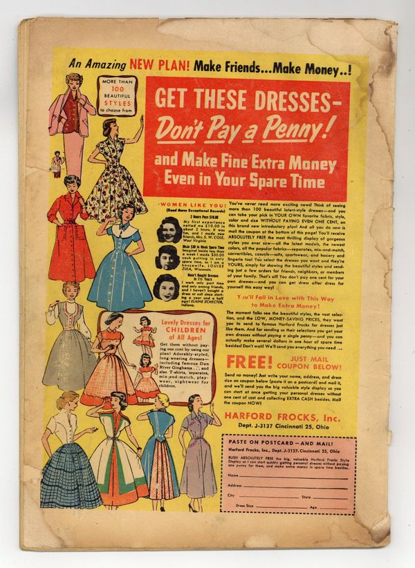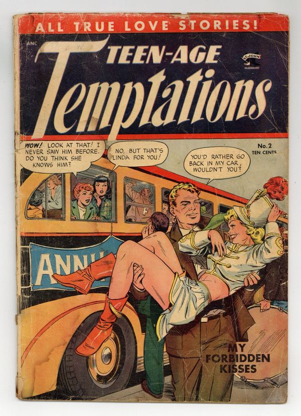 Cover by Matt Baker. Love and scandal from St. John, with plentiful art by good-girl art legend Matt Baker. Two-fisted Herb and fast-talking Tom keep Nina safe in her rough neighborhood, but what happens when she must choose between them? Pretty Madge flirts to get what she wants, until she meets Brad, and learns her reputation has preceded her. Ginny falls for carnival huckster Thorne, and he leads her happily into the "carny" lifestyle. Secretary Jane secretly loves co-worker Larry, but he's engaged to the boss's spoiled, domineering daughter. Cover by Baker. Fighting for My Love; My Forbidden Kisses; I Was a Carnival Come-On Girl; Comedy Column; Gag-Bag; My Dance with Danger; I Was Only Guilty of Love. 32 pages, Full Color. Cover price $0.10.