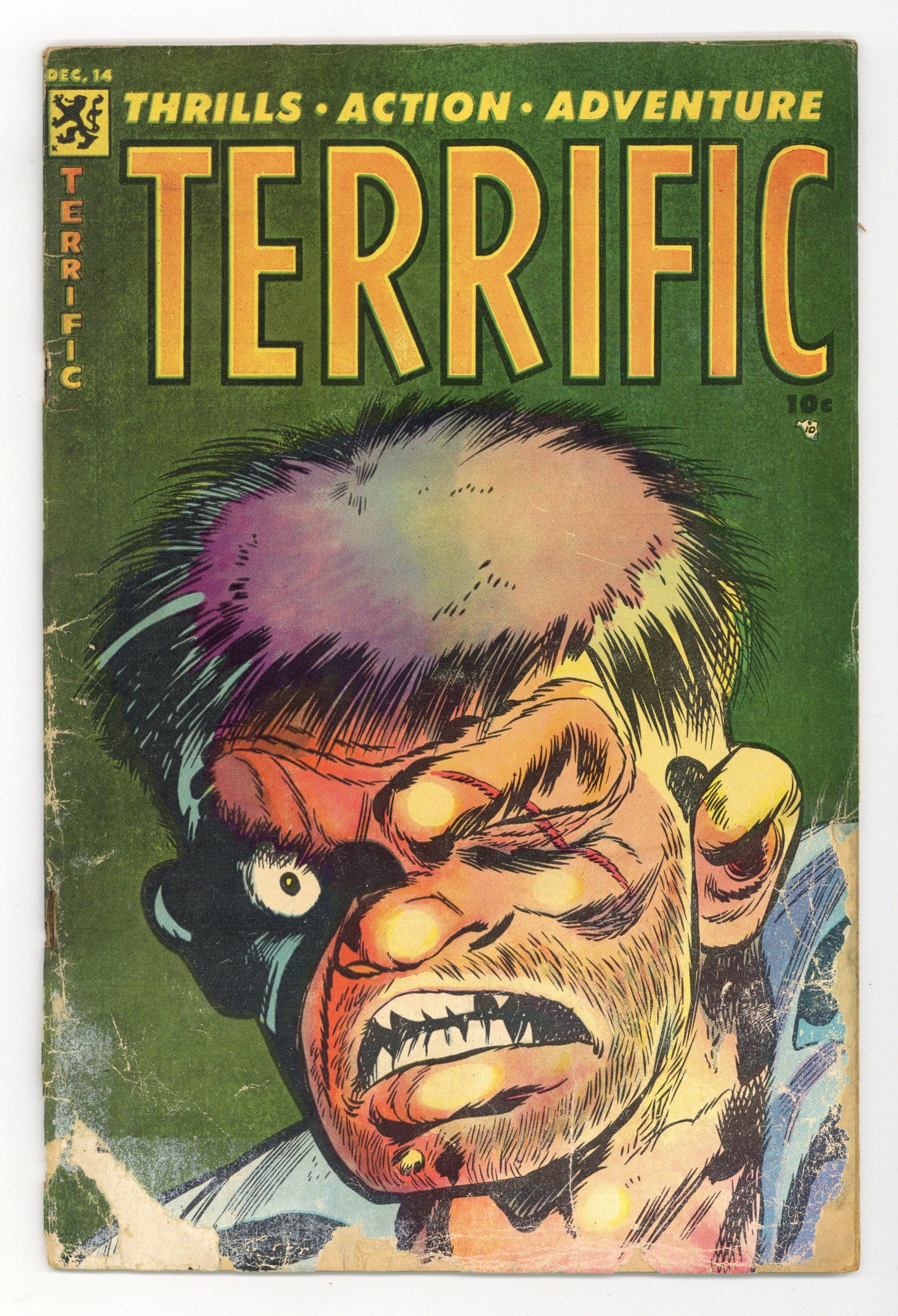 Cover by Don Heck. Stories and art by Marty Elkin, Don Heck, Ross Andru, and Rudy Palais. Numbering continues from Horrific (1952) #13. Terrific Comics served as the transition title as pre-Code horror comic Horrific was transformed into kid-friendly superhero comic Wonder Boy. John watches in horror as his Egyptologist wife Myra becomes deeply involved in the past and eventually summons the Egyptian god Anubis. A woman stalked by a witch and a zombie seeks refuge from powerful Mother Jones. Dancer Sonia returns from the dead, determined to dance her partner Igor to death. Dead on Arrival; Human Cross; The Wolf Twins; Mind over Matter; Dance of Death. There was no issue #15. 32 pages, Full Color. Cover price $0.10.