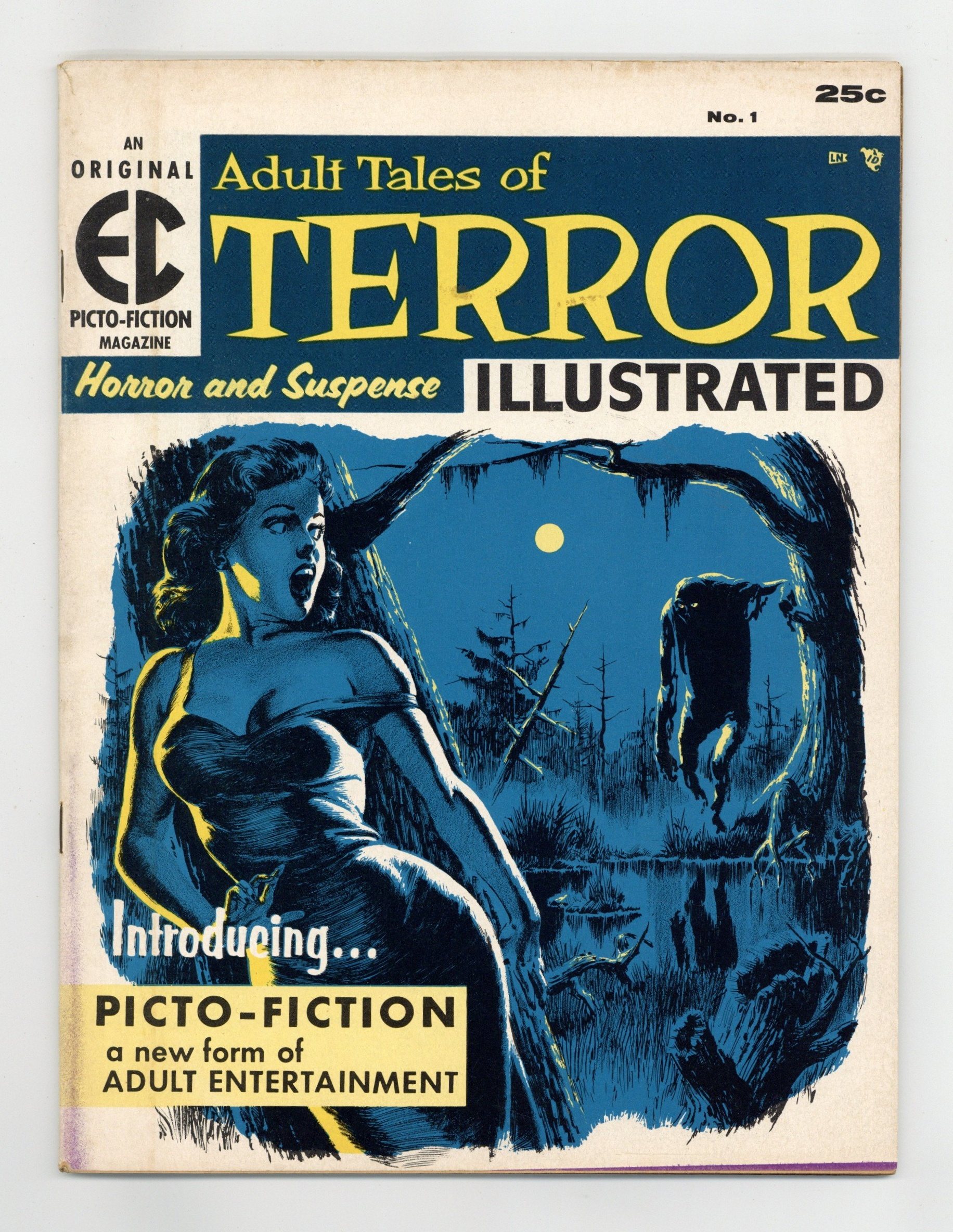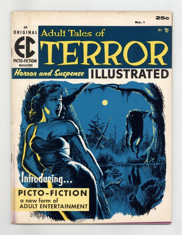 Cover by Reed Crandall. Stories by John Larner, Jack Oleck, and Al Feldstein (credited as Alfred E. Neuman). Art by Reed Crandall, Joe Orlando, George Evans, Graham Ingels, and Johnny Craig. Part of EC's Picto-Fiction line, published in response to the Comics Code, featuring horror tales in text stories copiously illustrated by EC's lineup of artists. A carnival barker plots to get away with murder by faking his own death, but he fakes it a little too well. Villagers learn the horrifying secret of the basket that Vincent always carries on his shoulder. A gorilla's paw purchased in a strange little shop grants wishes, but at a terrible price. Some stories are credited to Alfred E. Neuman, a name soon to be irrevocably connected to MAD Magazine. Lush cover by Reed Crandall. The Sucker; Sure-Fire Scheme; Rest In Peace; The Basket; The Gorillas Paw. 8 1/2-in. x 11-in., 60 pages, B&W with single-color accents. Cover price $0.25.