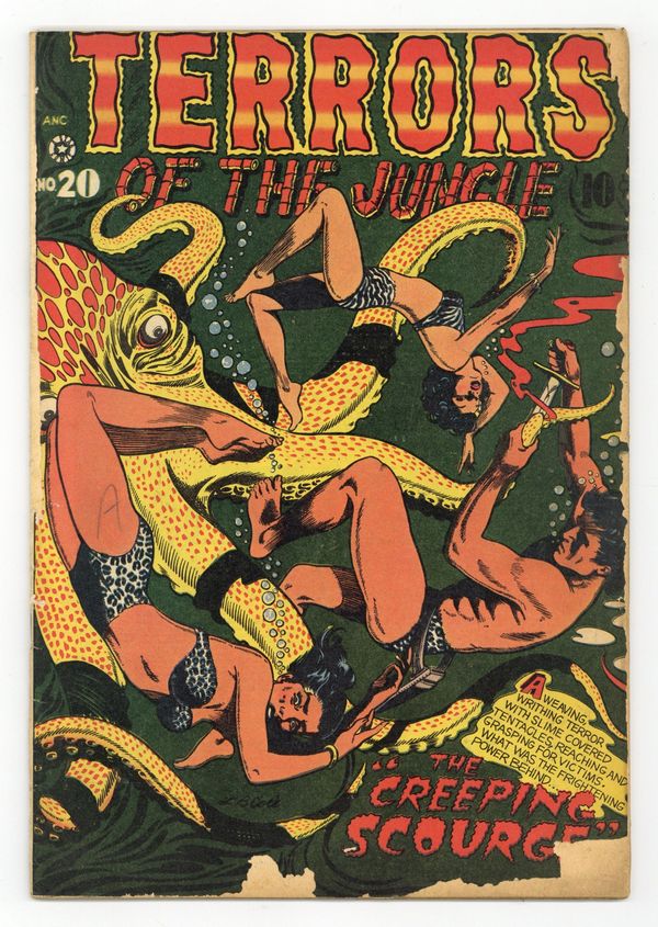 Cover by L. B. Cole. Stories and art by Jay Disbrow and others. Pre-Code jungle adventures from L. B. Cole's Star Publications. Bombo battles a tentacled horror from deep in the jungle. Tange discovers the Temple of the Moon God. A former circus strongman ventures into a lost African kingdom that supposedly holds the secret of eternal life. Fun octopus attack/good-girl cover by L. B. Cole. Bombo: The Creeping Scourge; Revenge of Blood; Tange: The Evil Heart; The Curse of Sheah. 36 pages, Full Color. Cover price $0.10.