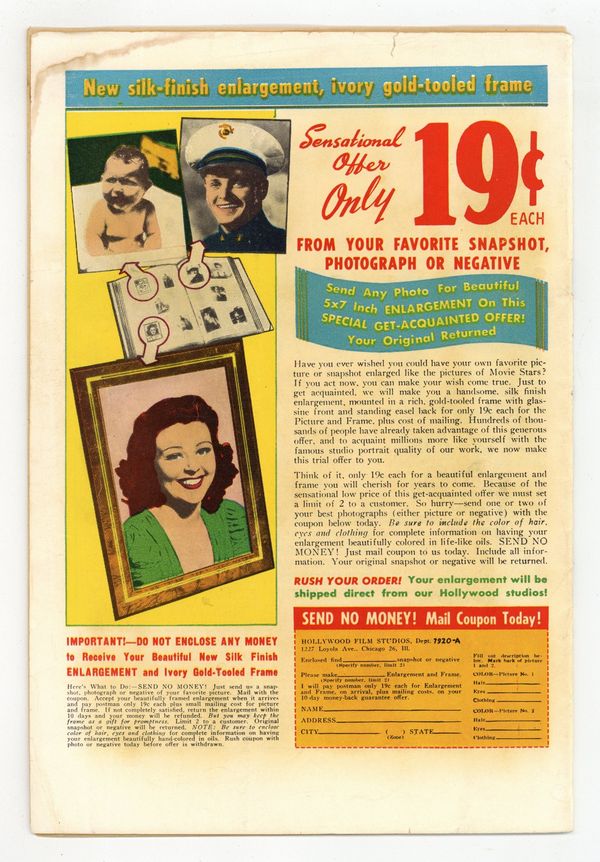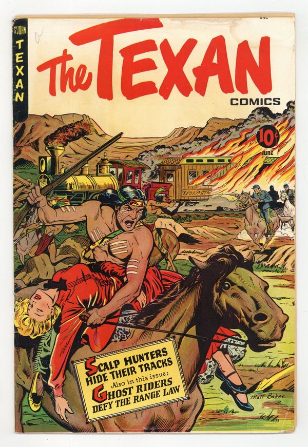 Cover by Matt Baker and Ray Osrin. Stories and art by Matt Baker, George Tuska, Richard Speed and Howard Larsen. "The Texan" and other heroes battle owlhoots and rustlers in the Old West. Smoky Horse dreams of peace between the Apaches and the settlers, but that makes him suspect to both groups, in a story with art by good-girl art legend Matt Baker. In another Baker story, action girl Yukon Jane battles wolfpacks and pelt poachers in the northern woods. The Marshal of Eagle Springs tracks masked raiders who use silver bullets, but these are no Rangers. Plus biographical pages on Crazy Horse, Harry Tracy, Jesse James, and Arizona Pete. And a story with art by future Marvel legend George Tuska. Cover by Baker. Jesse James; Scalp Hunters Hide Their Tracks; Arizona Pete; Ghost Riders Defy the Range Law; Crazy Horse; The Renegades' Last Raid; The Lone Vigilante; Tracy the Outlaw. 32 pages, Full Color. Cover price $0.10.