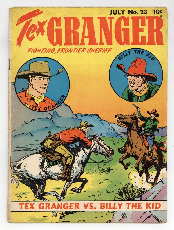 Buffalo Bill bio. "Tex Granger Meets Billy the Kid!"; After Tex runs Billy the Kid's sidekick out of town, The Kid decides to rob the town's bank; Tex tracks the Kid down, but he escapes when Tex has to rescue a drowning man. Animals of the West illustration. "Buffalo Bill" Famous Fighters of the Frontier text story by Ferris Weddle. Untitled My Most Interesting True Experience text story by Tim Holt; RKO western star Tim Holt recounts an experience as a bombardier during the last bombing run to Japan of World War II. Untitled Tex Granger story; A Mexican, Ehto Morales, and his mule come to Jacknife and make an enemy of an abusive cowboy; The cowboy and a friend rob a bank and try to frame Morales. "The Truth About the Golden West"; Fact page about incidents in the Old West involving gold. "Hector Goes West!", art by Vic Herman; Hector finds that the only "wild" part of the wild West is when they shoot movies. "Remember the Alamo!"; Brief summary of the events leading up to the battle at the Alamo in Texas in 1836. 36 pgs., full color. Cover price $0.10.