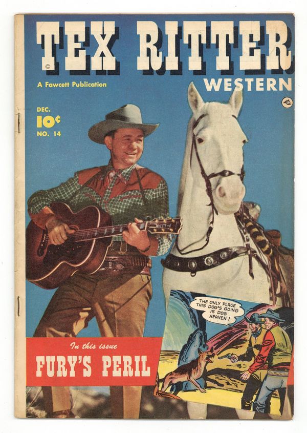 Published Dec 1952 by Fawcett/Charlton.$9.60Stories and art by Tony Tallarico and others. Movie cowboy Tex Ritter tames the West with his six-guns, his horse White Flash and his dog, Fury. Outlaws decide Tex will no longer be a threat if they can get rid of Tex's trained dog, Fury. Tall tale-spinner Buffalo Bill reveals how to split a five-dollar bill among three people and still get five dollars back. In a two-part story, Tex tracks the masterminds behind a scheme to get outlaws out of jail by having them impersonated. Fury's Peril; Pinto Pete: A Gin-Dandy Retort; Loonie Les Is Prepared; Buffalo Bill: The Happiness Boy; Wanted Dead or Alive; The Payoff; Loonie Les: Doubly Safe; Pinto Pete: A Warming Experience; The Roundup. 32 pages, Full Color. Cover price $0.10.