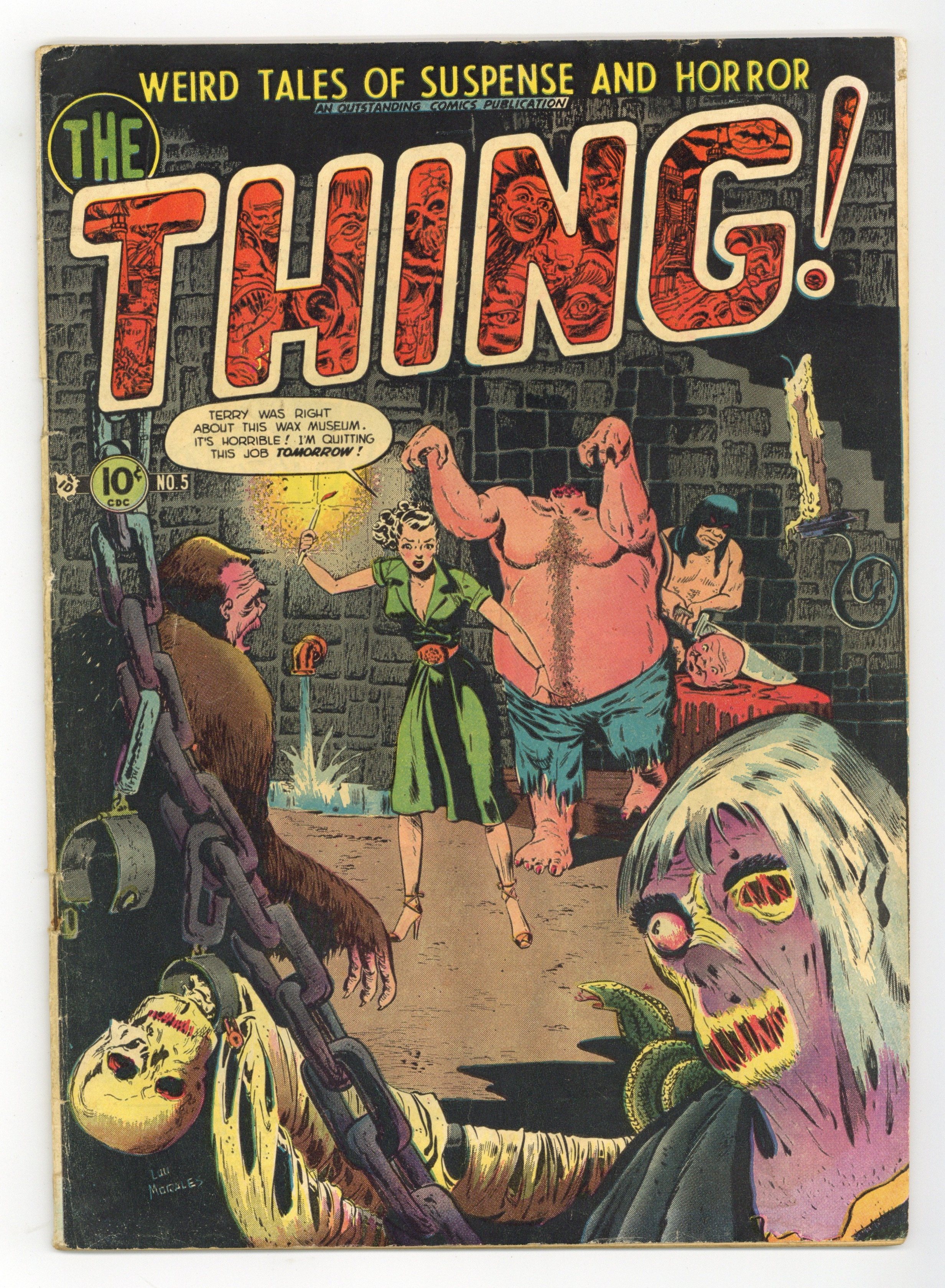 Severed head cover by Lou Morales. "Curse of Karnak," art by Bob Forgione; Professor Ambrose carelessly revives the mummy of King Mentu and sets free a plague of Egyptian gods running amok in the excavation camp. "Harmony of Horror," art by Bob Forgione; Jim Shervin kills Bruno Augustin, the rival for his love of the beautiful Cleo. "The Frustrated Ghost" text story. "Murderers' Row," art by Tex Blaisdell; Strange things happen in and around Professor Caglio's wax exhibition of murderers through history. "The Tavern of Terror," art by Collier; Young man spends the night in an inn haunted by an old female vampire. 36 pgs., full color. $0.10. Cover price $0.10.