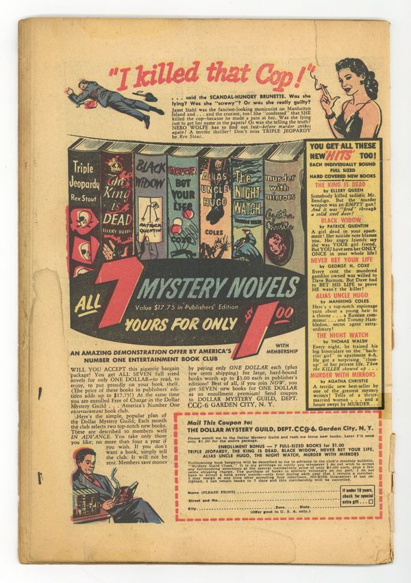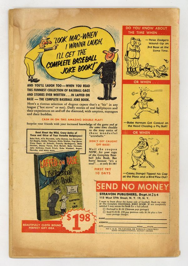 Published May 1953 by Charlton Comics Group.$90.00- Interior is complete. Full length spine split with missing back cover. Water damage.