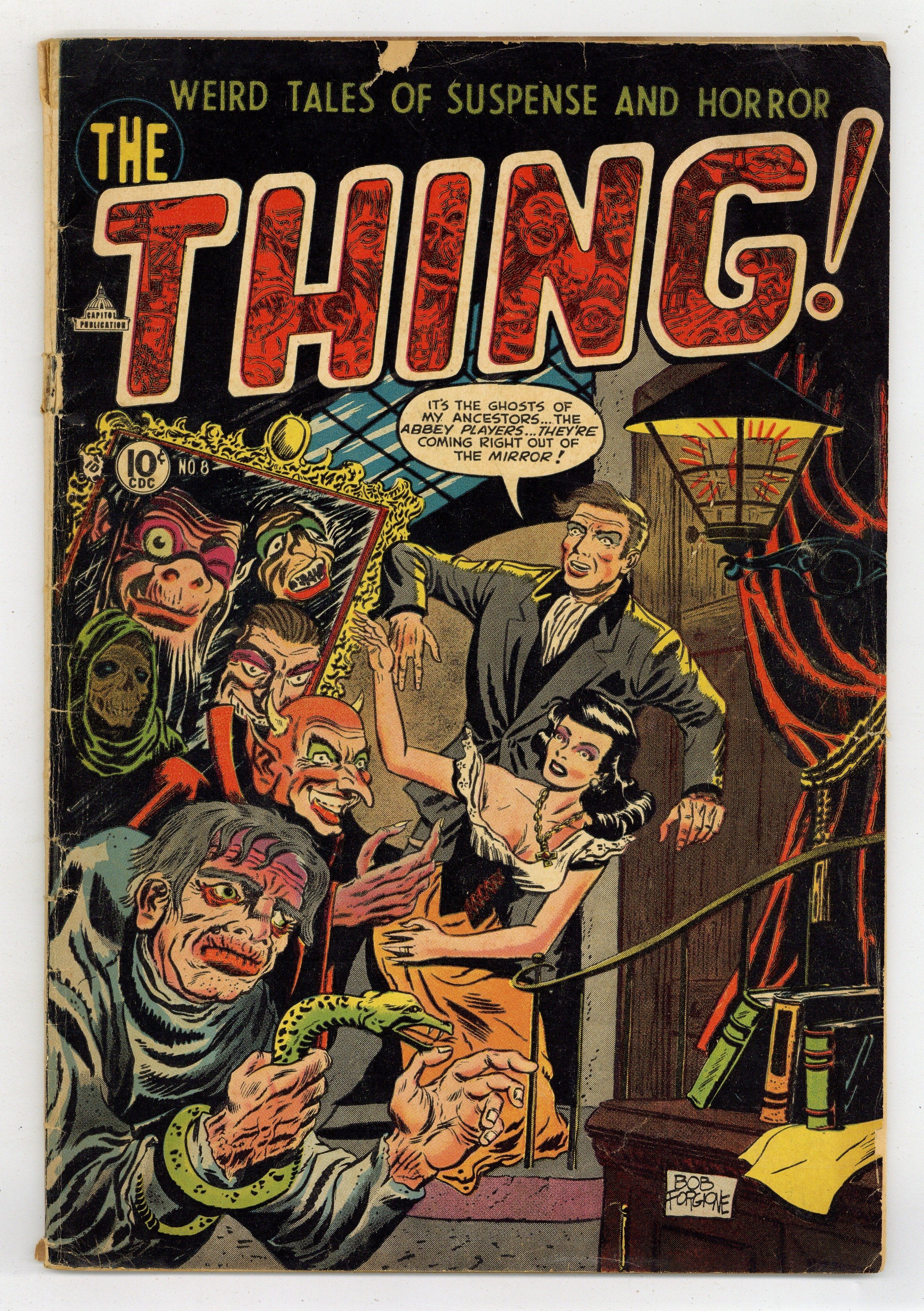 Cover by Bob Forgione. "The Ghost of Abbey Playhouse," art by Bob Forgione; Eric Abbey inherits a decrepit London theatre; When he opens Abbey Playhouse again to the public, the ghosts from the past won't allow it and bring the place down. "A Grave Situation," script by Carl Memling, art by John Belfi; Dying Mike Trenton tells his doctor a fantastic tale: the ghost of the man he killed while on a treasure hunt followed the party and took them out one by one. "The Green Mass" text story. "Vein of Irony," art by Bob Forgione; A vampire is loose in a hospital, but drinks poisoned blood. "Death Has Deep Roots," script by Carl Memling, art by Bob Forgione; A bunch of gangsters kill an old man for his hidden treasure. Having them cursed with his dying breath, the group dies one by one in grotesque fashions. 36 pgs., full color. $0.10. Cover price $0.10.