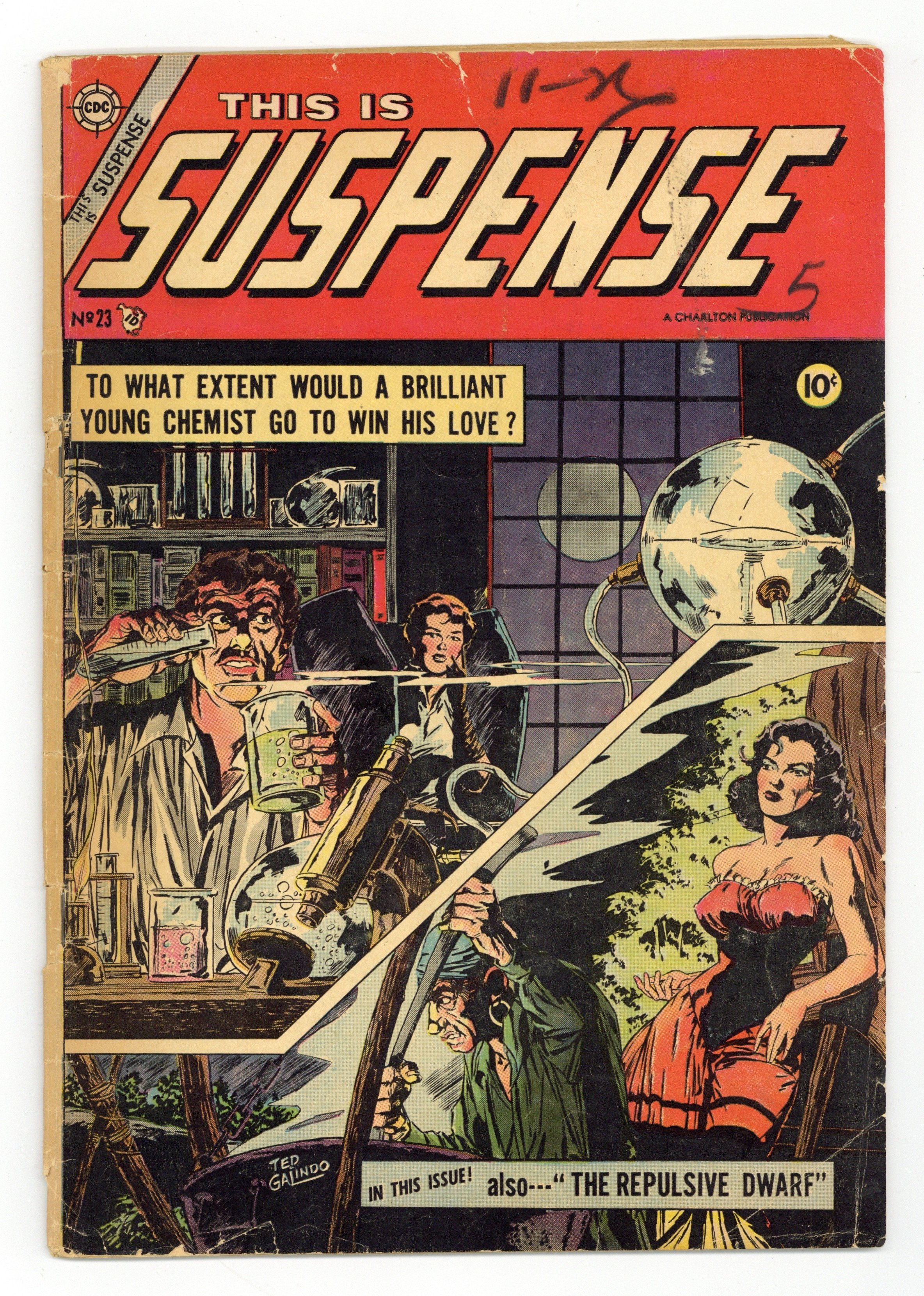 Cover by Dick Giordano. Stories and art by Wally Wood and Dick Giordano. Numbering continues from Strange Suspense Stories (1952 Fawcett/Charlton) #22. Short tales of science fiction, fantasy and horror with twist endings. An 25-page adaptation of the classic horror novel Dr. Jekyll and Mr. Hyde, featuring art by comics legend Wally Wood. Dr. Jekyll's experiments with humanity's dark side succeed only too well. In another story, a dwarf falls in love with a kind, beautiful gypsy woman, but fears she could never love him. The Choice; Dr. Jekyll and Mr. Hyde; Mine Menace; The Repulsive Dwarf. 32 pages, Full Color. Cover price $0.10.