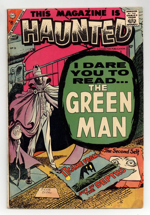 Cover by Steve Ditko. Stories by Joe Gill? Art by Steve Ditko and Bill Molno & Vince Alascia. Dr. Haunt hosts four tales: Juan fights against the thing that comes out of the sea in "From Out of the Depths"; a man seeks a cure for his green skin, but there isn't one in "The Green Man"; a scientist refuses to slow down until he creates a clone and learns the value of real human life in "The Second Self"; and a scientist accidentally shrinks himself to nothing in "The Man Who Disappeared"! Plus: An old man recalls his encounter with mermaids in "Old Man of the Sea"! Also: A man and his wife move to a supposedly haunted house, but uncover the real story behind the "haunting" in the 2-page text story "Wailing Walls"! 32 pages, full color. Cover price $0.10.