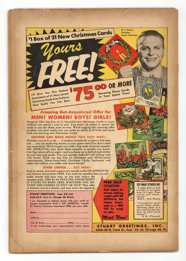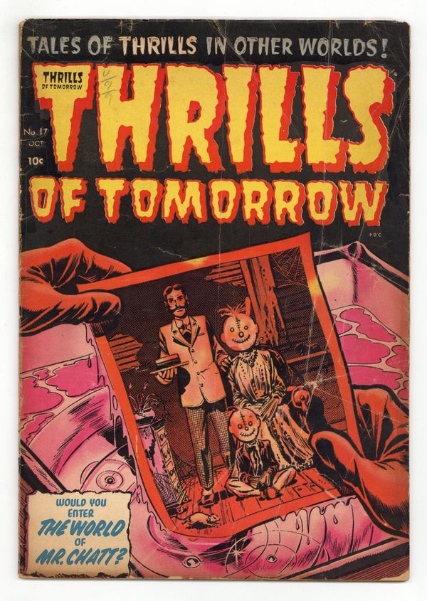 $125.00Cover by Howard Nostrand. Stories and art by Joe Certa, Bob Powell, Howard Nostrand, and Rudy Palais. Numbering continues from Tomb of Terror (1952) #16. As the social tide turns against horror comics, Harvey renames Tomb of Terror to this less-horrific title, but continues with grisly stories reprinted from Witches' Tales. In one of the most egregious examples, a cruel Caribbean governor executes criminals by having them eaten alive by crabs. A couple purchases a grotesque statue in a curio shop that curses them to destroy each other. A men's club doesn't expect the Devil himself to show up at their weekly seance. League of the Damned; Ghost Doctor; Curse of the Statue; Six Chances to Die; The Blood Plant; Invitation to Doom; Screaming City. 36 pages, full color. Cover price $0.10.