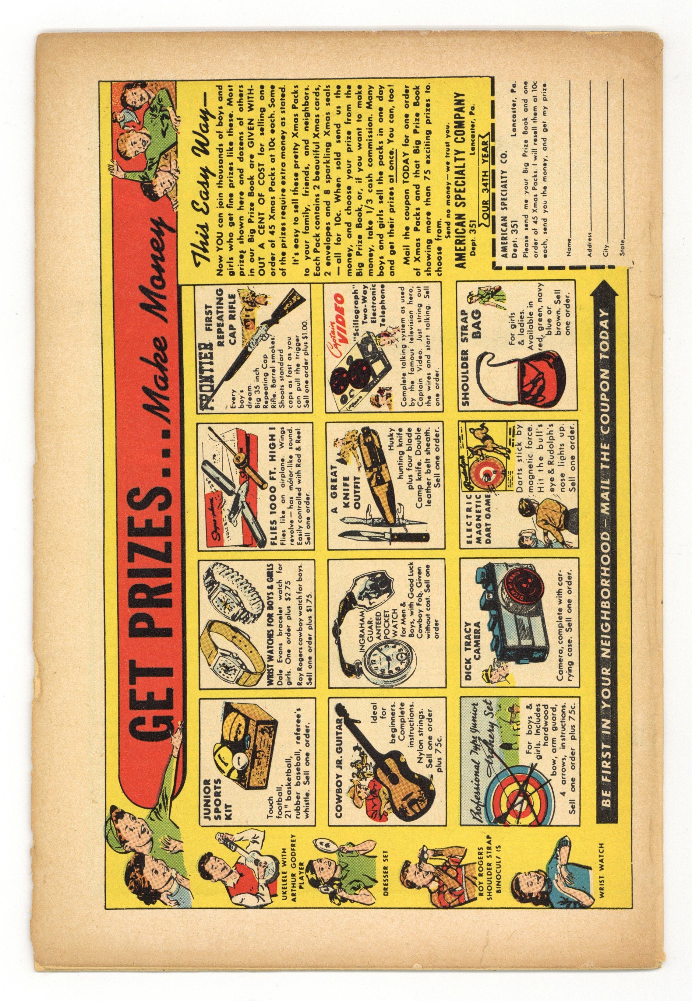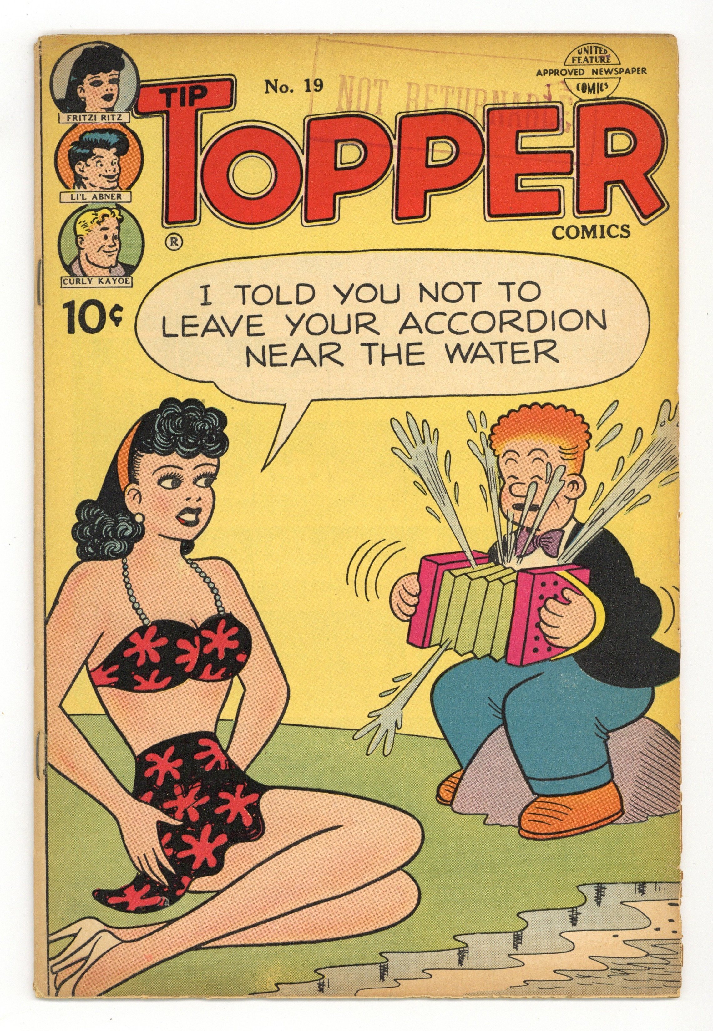 Cover by Ernie Bushmiller. Stories and art by Ernie Bushmiller, Charles Schulz, Al Capp, Sam Leff, and Henning Mikkelsen. Tip-Topper Comics collected some of United Features Syndicates most popular comic strips of the 1940s in full color, including Lil Abner and Fritzi Ritz. Fritzi was later known as "Aunt Fritzi" in the Nancy comic strip. Fritzi finds creative ways to save her hat and shoes from the weather. One of the backup strips in the comic is Charles Schulz's Peanuts, then only in its third year; several daily strips are presented in full color. Curly Kayoe's boxer buddy Mickey wants to retire from the ring so he can become a painter, but he needs to box to afford his art classes. Plus a Li'l Abner storyline by Al Capp. Fritzi Ritz; Peanuts; Li'l Abner; Curly Kayoe; Ferd'nand; Stamp Tips. 32 pages, Full Color. Cover price $0.10.
