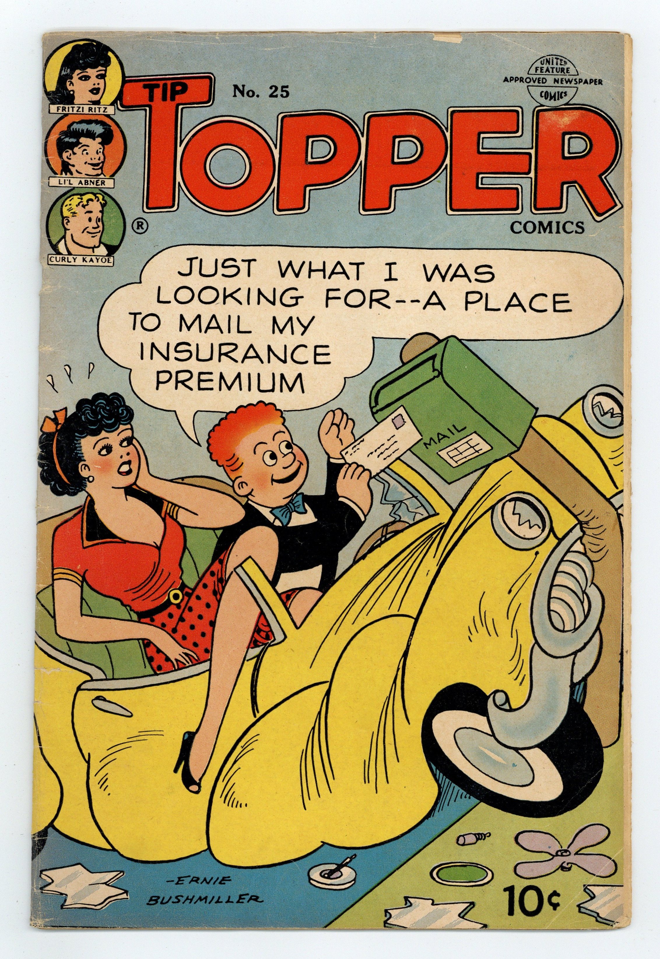 Cover by Ernie Bushmiller. Stories and art by Ernie Bushmiller, Charles Schulz, Al Capp, Sam Leff, Henning Mikkelsen, and Elsie Hix. Tip-Topper Comics collected some of United Features Syndicates most popular comic strips of the 1940s in full color, including Lil Abner and Fritzi Ritz. Fritzi was later known as "Aunt Fritzi" in the Nancy comic strip. Fritzi and Phil have a picnic encounter with some hungry hobos. One of the backup strips in the comic is Charles Schulz's Peanuts, then only in its fourth year; 2 daily and 2 Sunday strips are presented in full color. Snoopy earns a spot on the kids' baseball team when he tags Charlie Brown "out." It's Sadie Hawkins Day, in a Li'l Abner storyline with an "Orson Wells" cameo. Plus the Ripley-like Strange as It Seems. Fritzi Ritz; Peanuts; Li'l Abner; Curly Kayoe; Ferd'nand; Strange as It Seems; Stamp Tips. 32 pages, Full Color. Cover price $0.10.