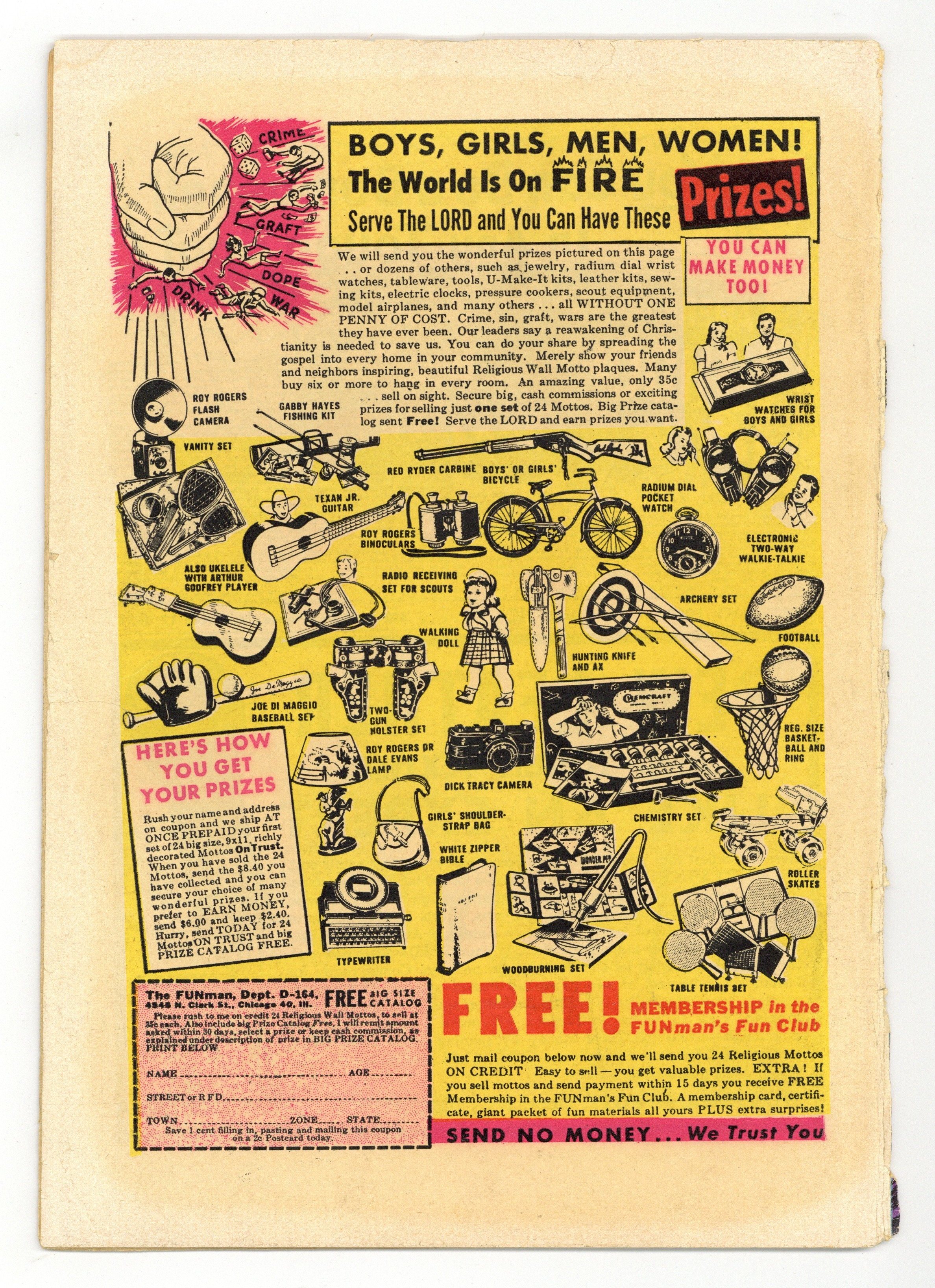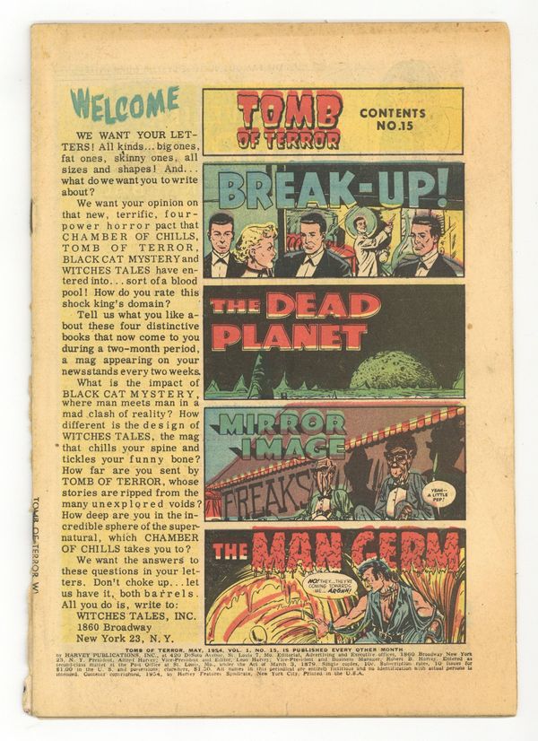 Cover by Lee Elias. Stories and art by Joe Certa, Bob Powell, Nat Barnett, and Jack Sparling. Tomb of Terror was one of Harvey Comics' notorious pre-Code horror comics. A scientist's wife decides to get rid of her husband's robot duplicate, then realizes she's made a horrible mistake. An explorer climbs inside a gigantic statue before realizing it's actually a living giant. Exploding-face cover by Lee Elias is one of the most notorious covers of the pre-Code era. The Dead Planet; Terror Tricks; Escape!; Mirror Image; Break-Up; Experiment; Dream...or Nightmare?; The Man Germ. 36 pages, full color. Cover price $0.10.