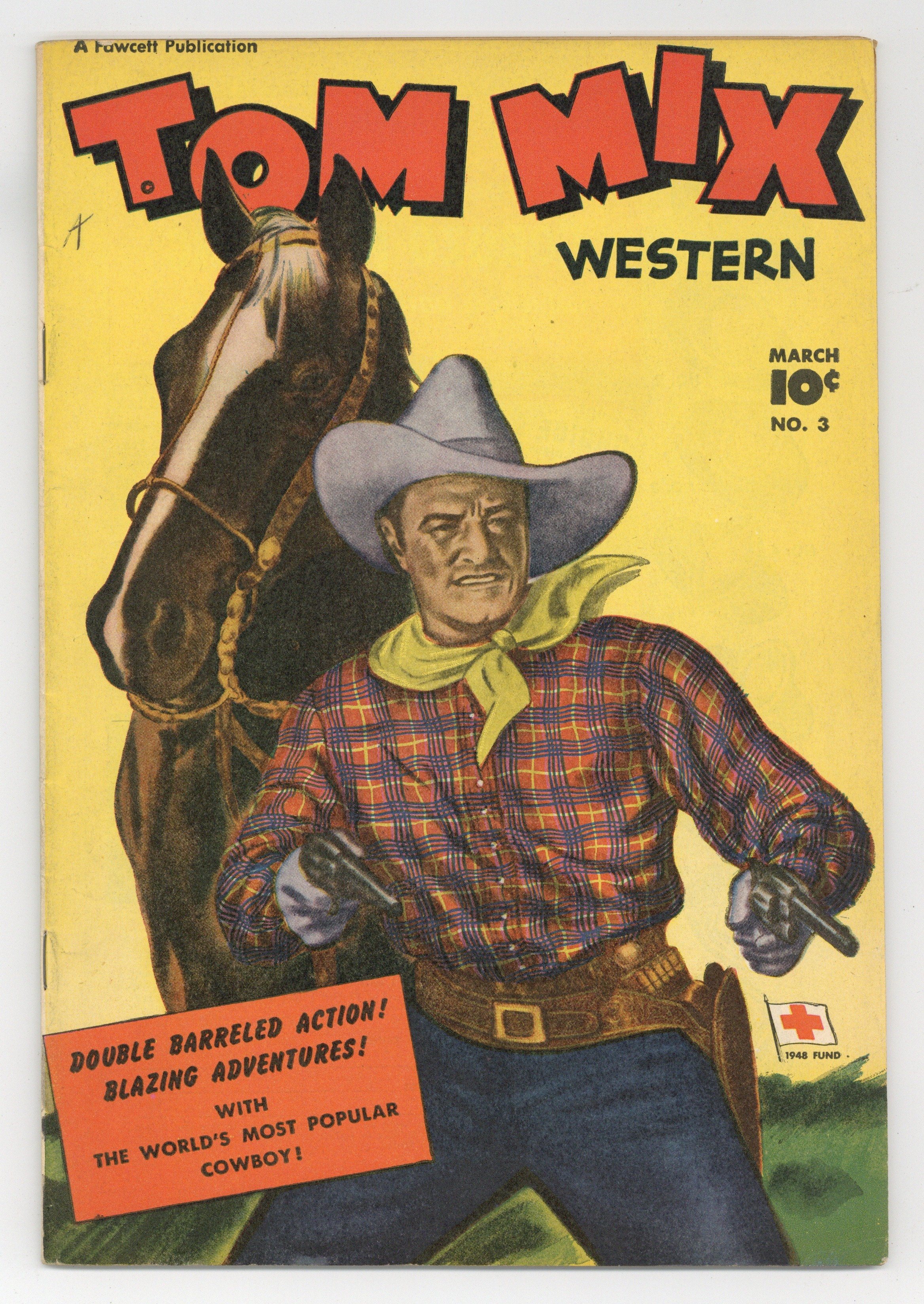 Stories and art by Al Liederman and Carl Pfeufer. Silent-movie cowboy Tom Mix became a pop-culture icon with his 1940s radio show and this tie-in comic. Before Tom can stop an outlaw, he must rescue a trapped Ranger from a raging forest fire. To prevent a fight over a water source from erupting into bloodshed, Tom shoots the guns out of five men's hands in one panel. Tom meets Celia, who has tracked her father's killer from all the way Back East. The Blaze of Death; Cowboy Cal; Saddlehead; Doc Greene's Dilemma; The Badman Wins; Tumbleweed Jr.: School Daze; Round Up Time with Tom Mix; The Whip; Whipper-Snappers; Scales of Justice. 48 pages, Full Color. Cover price $0.10.