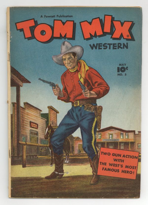 Stories and art by Al Liederman and Bill Brady. Silent-movie cowboy Tom Mix became a pop-culture icon with his 1940s radio show and this tie-in comic. Tom's friends Dick and Moonbeam Runningeagle are threatened by the return of Skunkheart, who wants a human sacrifice. Tom's old foe The Whip (from issue #3) returns with vengeance on his mind. Jed inherits a huge diamond from his uncle, but his two no-good cousins Ned and Red are keen to have it for themselves. The God of Evil!; Billy the Kid and Oscar; The Whip Stings Again!; Bedside Battle; Death Prances in the Arena!; Cowboy Cal; Tumbleweed Jr. Paddles Away; Round Up Time with Tom Mix; Saddlehead; The Death Diamond! 48 pages, Full Color. Cover price $0.10.