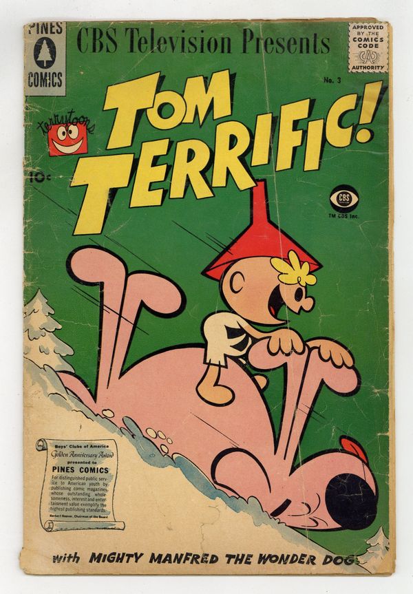 "Pent Up Pals"; Tom is not getting mail from his pen pals, so he transforms into a stamp to trace a letter sent to him. "A Kingly Problem"; Sidney the elephant is afraid of mice so he asks the king of beasts for advice. "Foolish Fog" text story starring Tom Terrific, Manfred the Wonder Dog, and Isotope Feeney. "Boodleberry Pie"; Manfred needs some of his favorite pie to get some energy, but farmer Boodle is out of berries. "First Class Villain"; Crabby just finished a correspondence course on how to be a master of disguise; First he's disguised as a bush, but then he has a more sinister plan. 36 pgs., full color. Cover price $0.10.