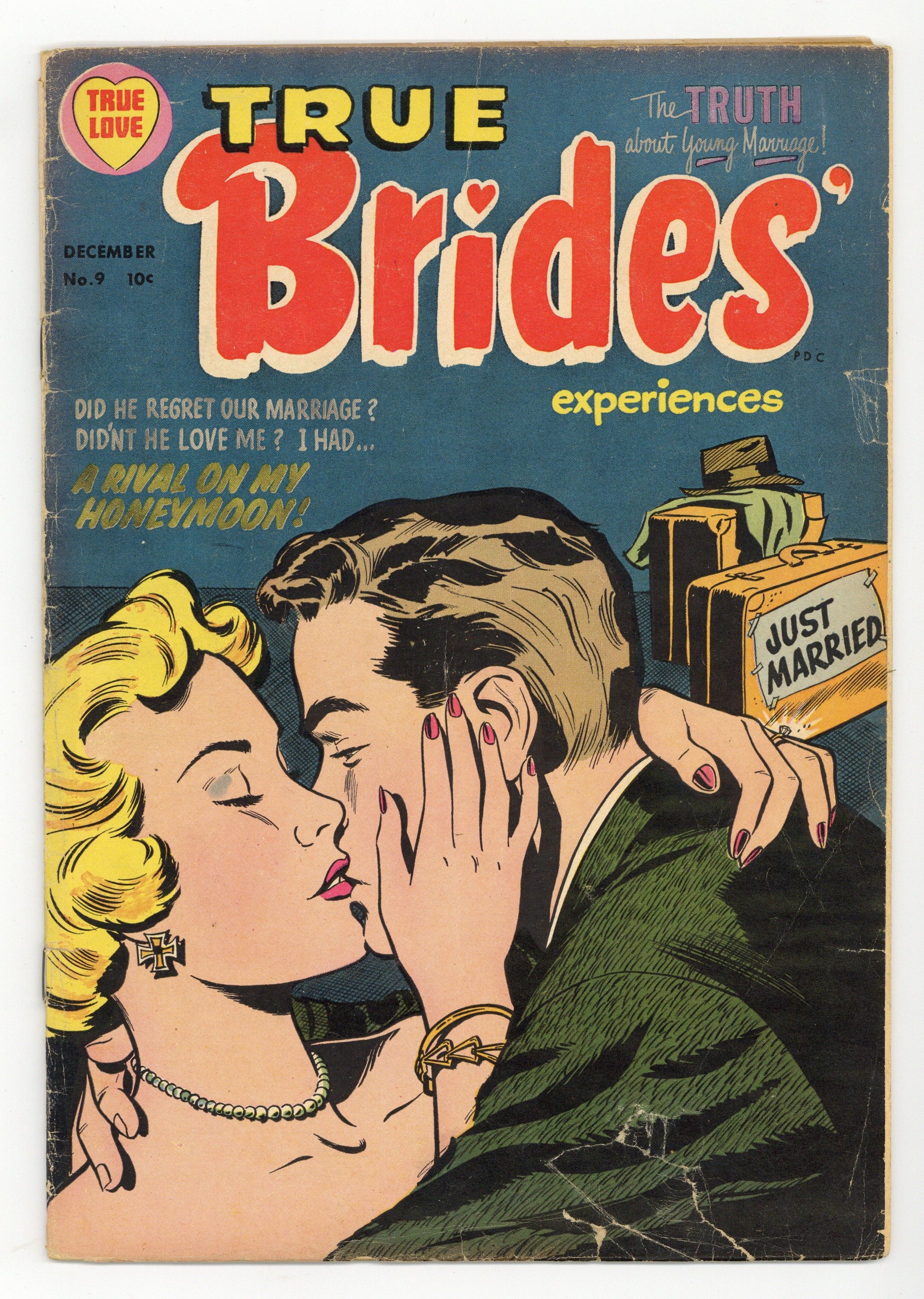 Stories and art by Bob Powell and others. Tales of young love and marriage from publisher Harvey. A small-town girl struggles to admit that she loves a man who's engaged to another woman. A teacher finds love with a stranger on a cruise, but she's not sure she can trust him. A woman relocates to escape her sullied reputation, only to find the past catching up with her. A Rival on My Honeymoon!; Romantic Stranger; I Was Ashamed of My Parents; Strange Romantic Customs; My Superstitious Heart; Wrong Prescription for Love; I Was a Failure on My First Date! 32 pages, Full Color. Cover price $0.10.