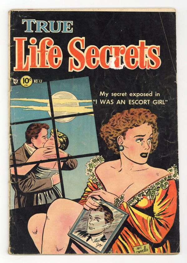 Cover by Art Cappello. Stories and art by Art Cappello and others. Early romance comics that include noirish tales of melodrama, scandal and deceit. Vivian works as a paid escort and falls for Jerry, but her boss Mike wants Vivian for himself. A woman, her husband, and a thief fall under the spell of a string of pearls. Judy decides to steal her friend Gilda's boyfriend, Jimmy. Snowbound; I Learned the Hard Way; How Not to Hold Your Man; Yes, I Was an Escort Girl; Green With Envy; The Desert Held My Secret!; Blinded By Glamour. 32 pages, Full Color. Cover price $0.10.