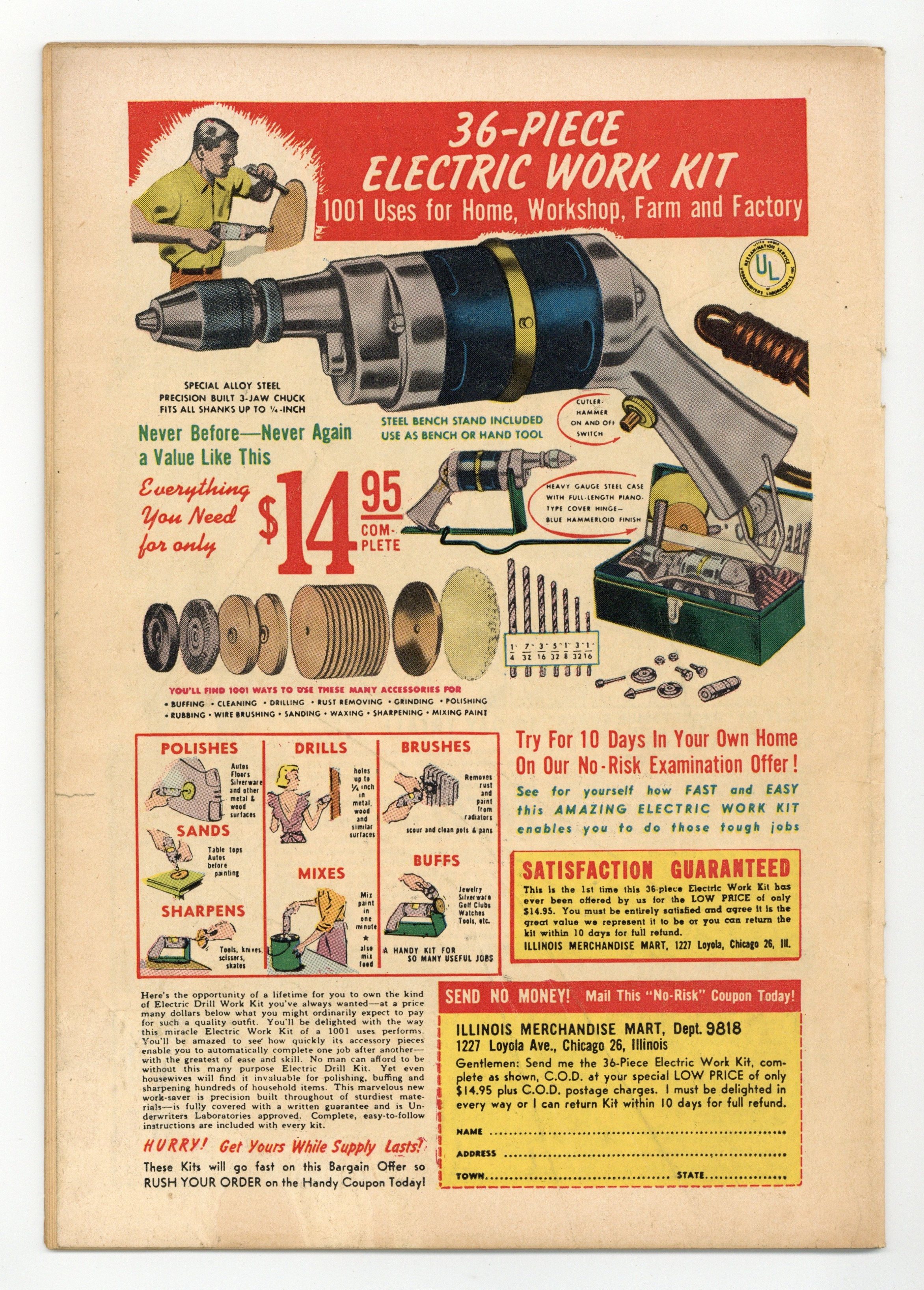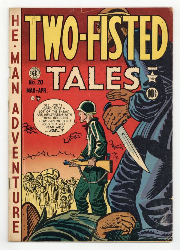 Cover by Harvey Kurtzman. Stories by Harvey Kurtzman. Art by John Severin, Will Elder, Wally Wood, Jack Davis, and Harvey Kurtzman. Harvey Kurtzman's legendary series enlisted top EC artists for gritty tales of war and adventure. North Korean troops disguise themselves as American soldiers after a massacre and run afoul of their own plan, in a story with inks by MAD legend Will Elder. Sailors rescue an amnesiac castaway who is searching for a fortune in Spanish doubloons. Battle fatigue takes its toll on American soldiers during the D-Day invasion, with art by Wally Wood. Massacred!; Devils in Baggy Pants!; Army Revolver!; Pirate Gold! 36 pages, Full Color. Cover price $0.10.