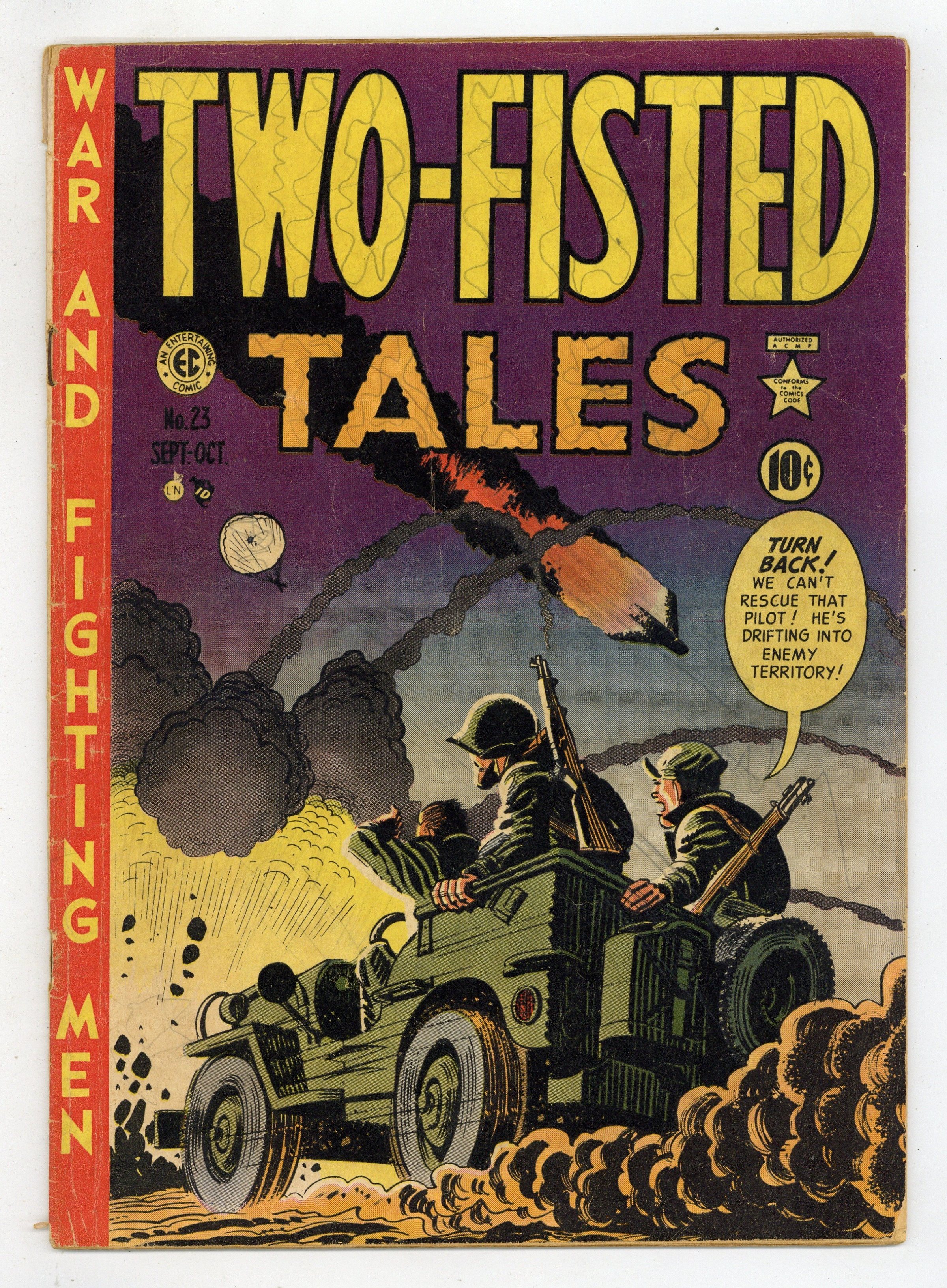 Cover by Harvey Kurtzman. Stories by Harvey Kurtzman. Art by John Severin, Will Elder, Wally Wood, Jack Davis, and Harvey Kurtzman. Harvey Kurtzman's legendary series enlisted top EC artists for gritty tales of war and adventure. Fighter pilot Strange loses the will to live after being deserted by his girlfriend back home, in a story with inks by MAD legend Will Elder. American and enemy forces race to reach an American pilot after a crash-landing, with art by Jack Davis. Veteran soldier Pappy tries to teach young soldiers how to stay alive on the battlefield, in a Wally Wood story. Death Stand!; Old Soldiers Never Die!; The Ditch; Kill!; Dog Fight! 36 pages, Full Color. Cover price $0.10.