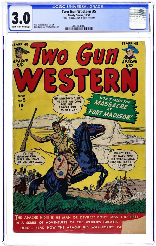 Cover by John Buscema. "Massacre At Fort Madison!", art by John Buscema; An Apache war party converges on a wagon train of white settlers and begins slaughtering them; Among the travelers are Alan Krandal, Bill Gregory and Bill's sister Mary; Alan's mother protects the children while they escape and she is killed by the Apaches; Getting clear of the carnage, Alan realizes that he has a twisted ankle and tells Bill and Mary to flee while he keeps the Apaches at bay; With no choice, the Gregorys leave their friend behind. "He Was Branded Yellow!", art by Syd Shores. "Dead Ending" text story. "The Renegade!", art by John Buscema. "Boomerang!". 36 pgs., full color. $0.10. Cover price $0.10.