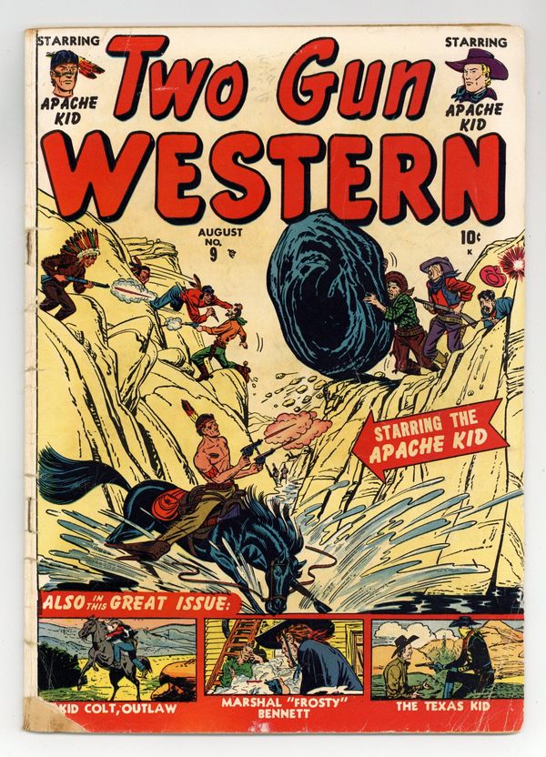 Cover by Chuck Miller. "The Vengeance of the Apache Kid," art by Werner Roth; When a band of Coyotes attack a stage coach, it is rescued by the Apache Kid who sends the renegade band of Native Americans fleeing; When the coach arrives at Fort Madison, it passenger Anthony Nichols - a businessman setting up a gold prospecting company - tells off Captain Bill Gregory for not doing anything about the attackers; Gregory is shocked when Nichols names an Apache Kid as one of his attackers. "The Gun That Ruled the West" text story. "Judgment Day," art by Pete Tumlinson. "Blood Will Tell." "Smokey Showdown" starring Texas Kid, art by Joe Maneely. 36 pgs., full color. $0.10. Cover price $0.10.
