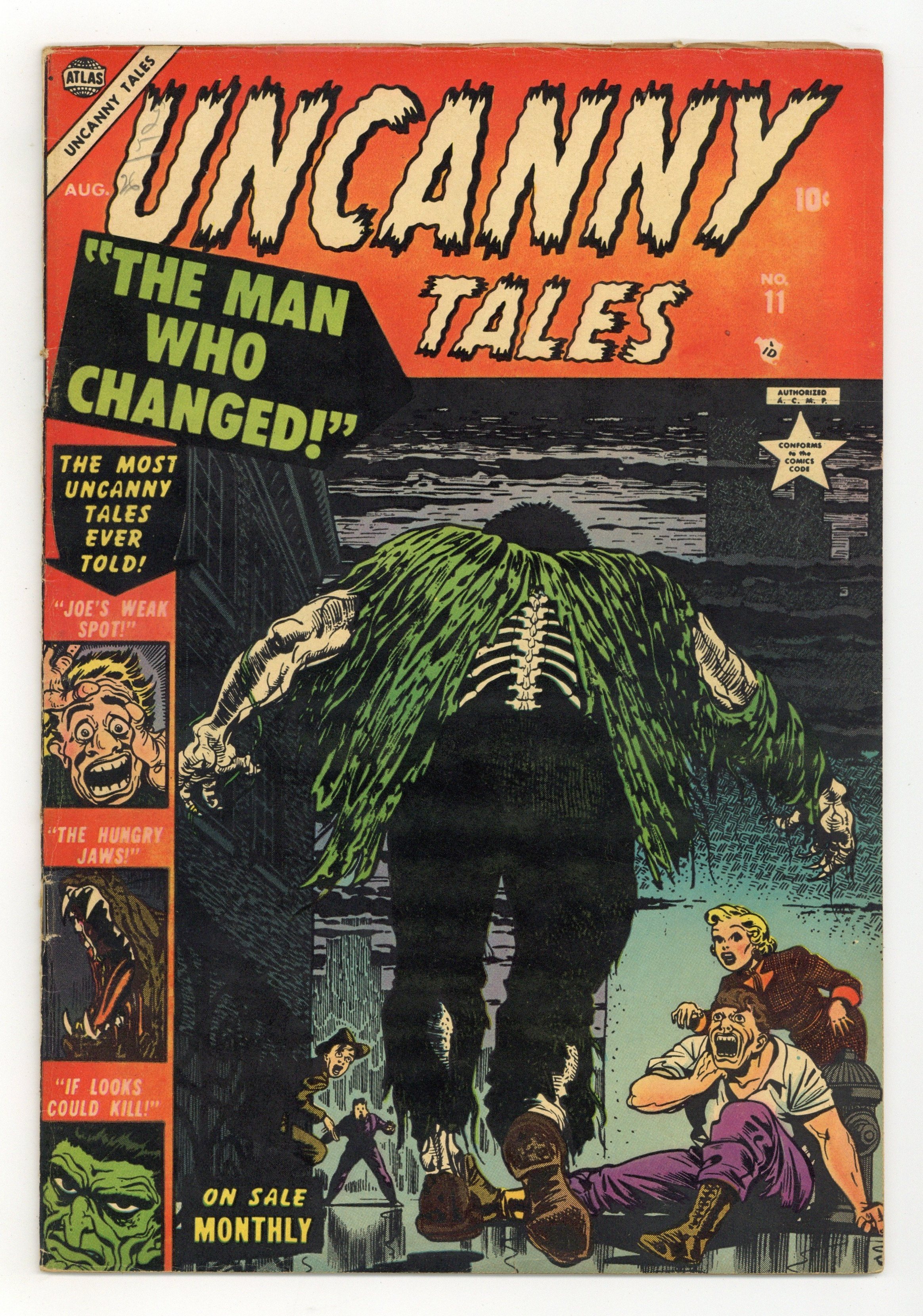 Cover by Bill Everett. Stories by unknown. Art by Bill Benulis, Harry Anderson, Gene Colan, Bill Walton, Sid Greene and Jack Abel. "The Man Who Changed" with art by Bill Benulis and Jack Abel - A timid, unimpressive man stays behind to witness an H Bomb test on an island with the guinea pigs figuring that any change will be an improvement. The bomb flash blinds and burns him, but when he recovers in the hospital, he finds that he has grown taller, powerfully built and handsome. He resolves to leave the institution, although the personnel attempt to restrain him for fear of his contamination, and marry the girl he's wild about. She reacts in fear to his presence though, and all people shun him. He returns to the test island where the guinea pigs accept him. Also in this issue: "If Looks Could Kill!" with art by Harry Anderson - When a beautiful woman cheats a smitten scientist out of ten thousand dollars to gamble with, he gets revenge by transforming her ageless beauty into stone; "The Hungry Jaws" with art by Gene Colan - A plantation owner attempts to buy time to ignite a moat defense against swarming ants by sacrificing his workers to them, but even though the ploy works, the ants cross over the burning moat by crossing over the dead ant corpses and kill him; "Joe's Weak Spot" with art by Bill Walton - A man finds that he cannot be the boxer he wants to be with his literal glass jaw; "The Mental Case" with art by Sid Greene - A psychologist treats a man who claims to have a demon in his head and ends up with it himself; and 2-page text story "The Sentence!", reprinted from Astonishing (1951 Marvel/Atlas) #9 (original title: "Vengeance of the Time Stream"). 32 pages, full color. Cover price $0.10.