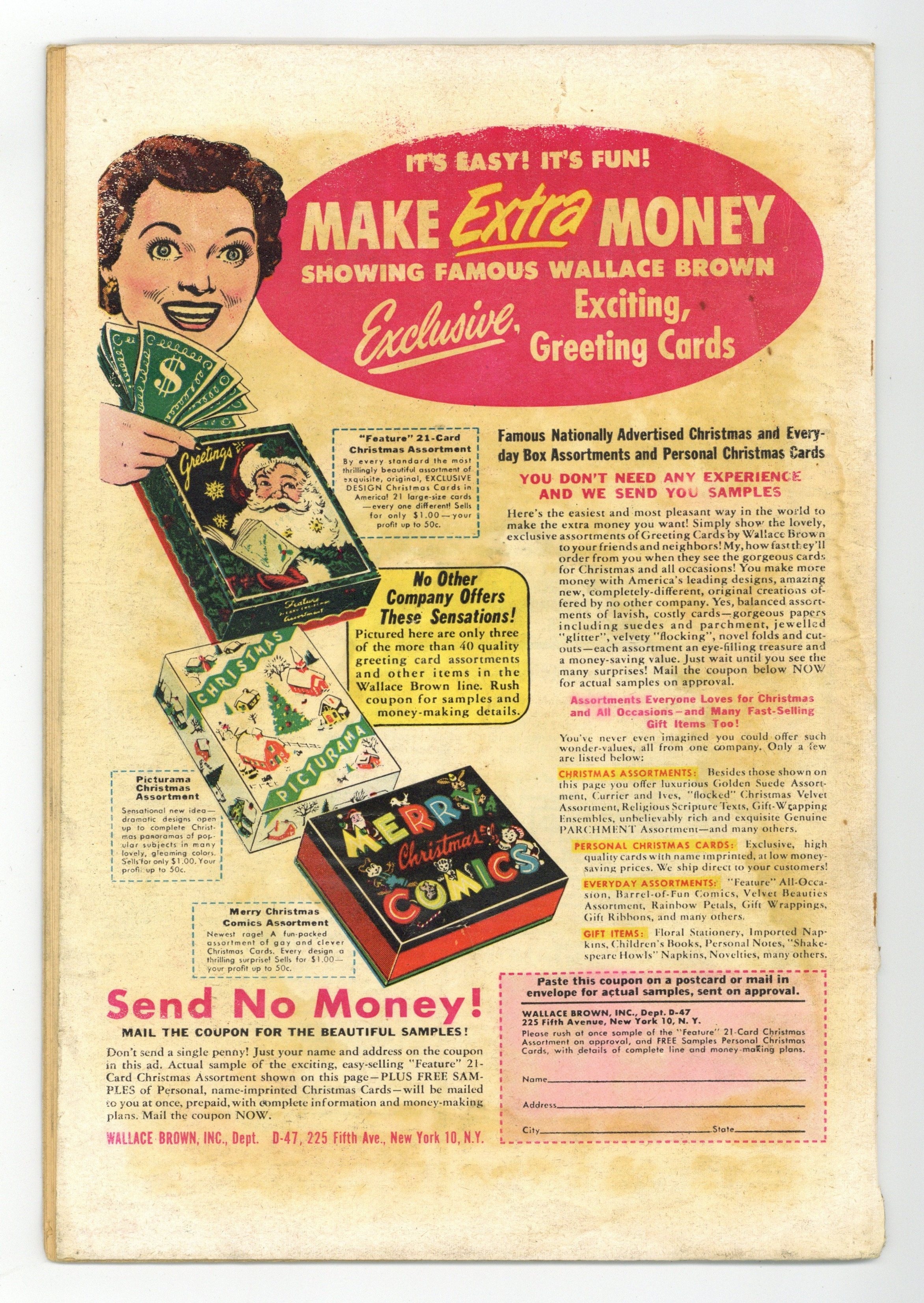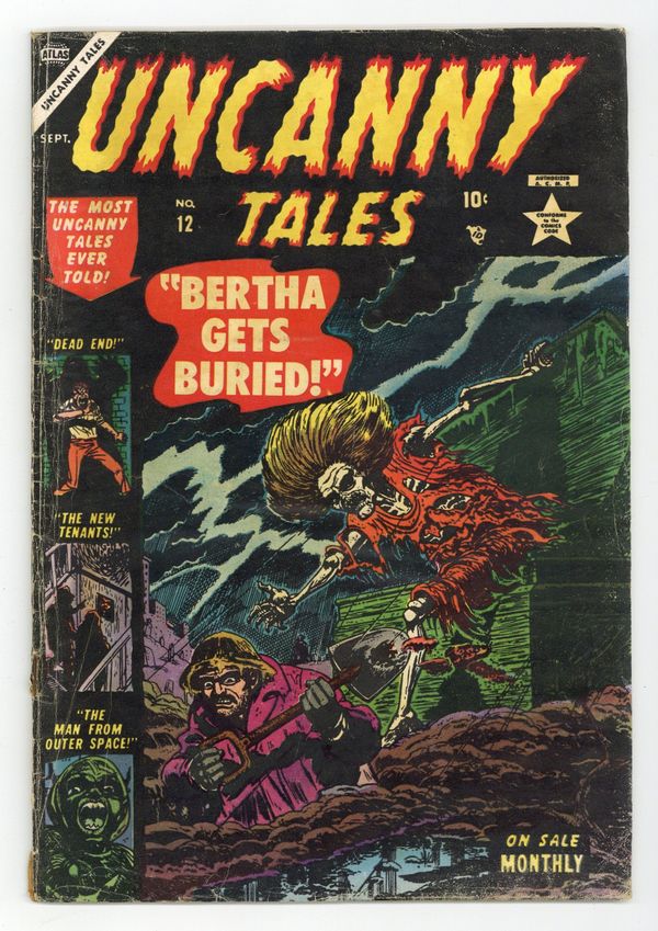 Cover by Carl Burgos. Stories by Burt Frohman and unknown. Art by Tom Gill, Bill Everett, Paul Reinman, Sam Kweskin and Bob Powell. In this issue: "Dead End!" by Burt Frohman and Tom Gill - A man travels back in time and kills his younger self; "The New Tenants" with art by Bill Everett - A man works for a miser who cheats people on real estate deals until he gets so fed up with his boss selling run down dumps to kindly old folks that he kills him and shores up the floor support in the cellar with the man's body; 2-page text story "The Phantom Gladiator"; "Devil's Island" with art by Paul Reinman - A man takes his unfaithful lover in the dark to the largest pearl she has ever seen...it's still inside the giant clam which closes on her; "Bertha Gets Buried" with art by Sam Kweskin - A man assumes his wife is cheating, kills her, and buries her in the cellar...it turns out that the man he thought she was cheating with is a handyman she hired to clean out the cellar like her husband asked her to...he is digging up the floor to lay down cement when he uncovers her body; and "The Man from Outer Space" with art by Bob Powell - A woman on a farm who is always complaining that she doesn't have six hands to do all the work that she is asked to gets her wish when an alien crash lands in the barn with the power to grow new limbs. 32 pages, full color. Cover price $0.10.